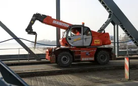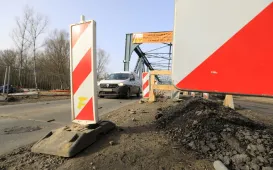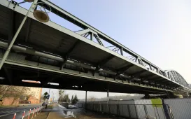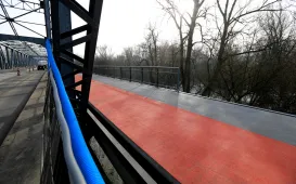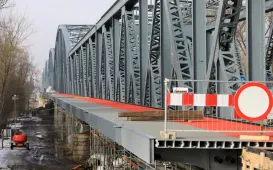 Trwa budowa ciągów pieszo-rowerowych na moście im. Józefa Piłsudskiego w Toruniu. Czterometrowe pasy zbudowane z paneli kompozytowych i pokryte powłoką anytypoślizgową zostaną zamontowane po obu stronach przeprawy. fot. Sławomir Kowalski