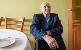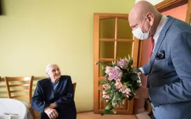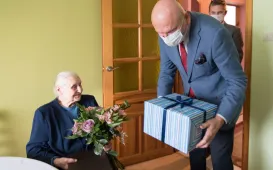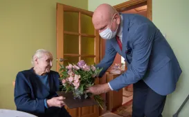 Pani Regina Wiśniewska z Torunia skończyła 2 września 2020 r. sto lat. Z tej okazji 3 września odwiedził ją z życzeniami prezydent Torunia Michał Zaleski. Fot. Lech Kamiński