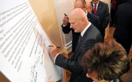 Ostatnia w mijającej kadencji, uroczysta sesja Rady Miasta Torunia odbyła się 13 listopada 2014 r. w Ratuszu Staromiejskim. Był to czas na podsumowanie minionych czterech lat toruńskiego samorządu. Podczas uroczystości wręczono także wyróżnienia. fot. Łukasz KlimkiewiczKontrakt Terytorialny podpisany
