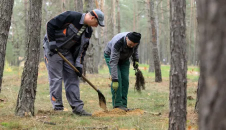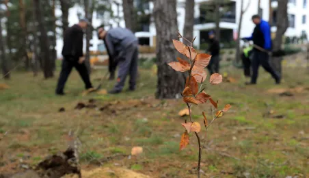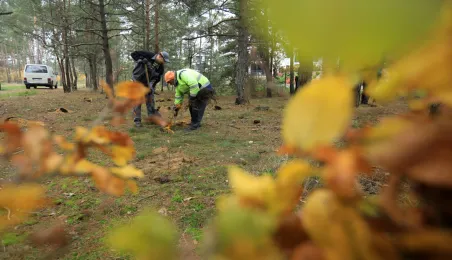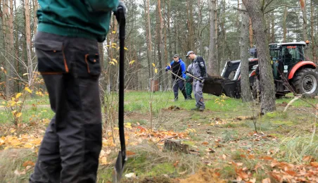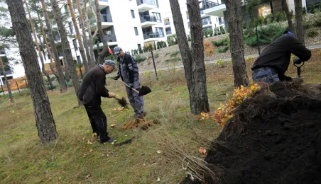 Trwa sadzenie 2000 szt. młodych drzew na terenie tzw. osiedla Jar. W dniu 16 listopada 2020 r. prace odbywały się w rejonie placów zabaw. Na osiedlu pojawiły się małe, bo zaledwie 30-60 centymetrowe sadzonki buków i grabów. Fot. Sławomir Kowalski