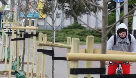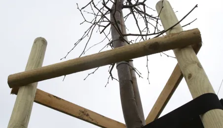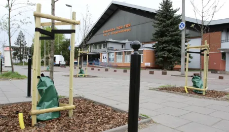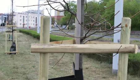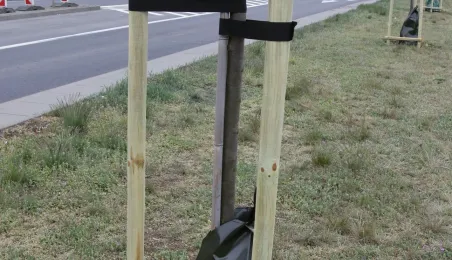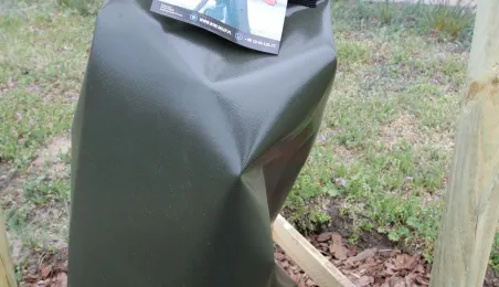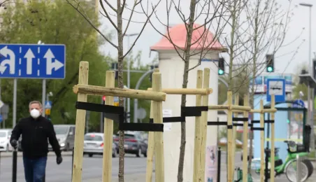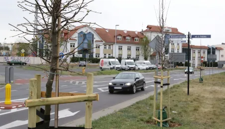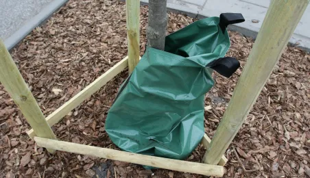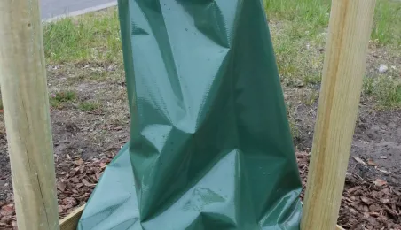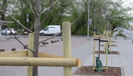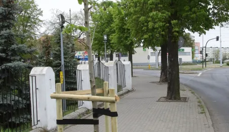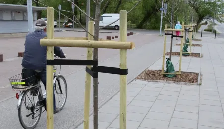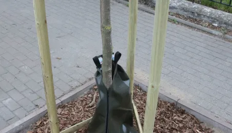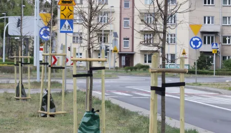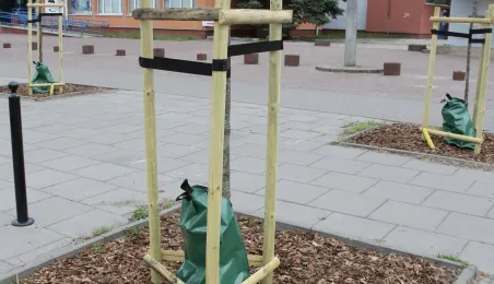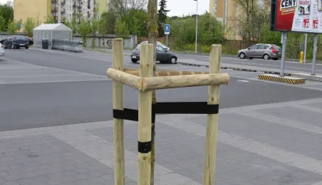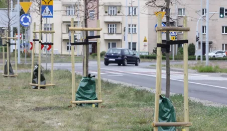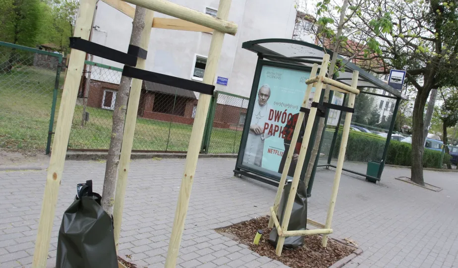 Prawie 300 nowych drzew zostało posadzonych w Toruniu wiosną 2020 r. Wszystkie zostały zaopatrzone w worki do kropelkowego podlewania typu treegator, z których woda uwalnia się do gleby przez długi czas po ich napełnieniu. Nowe nasadzenia pojawiły się m.in. przy ul. Bema, Broniewskiego, Marii Skłodowskiej-Curie, Gagarina i przy placu ToMiTo. Fot. Adam Zakrzewski