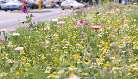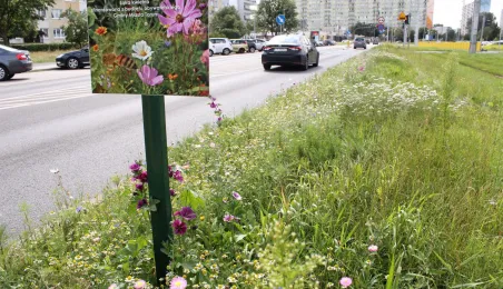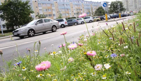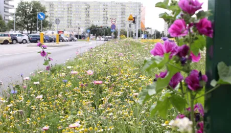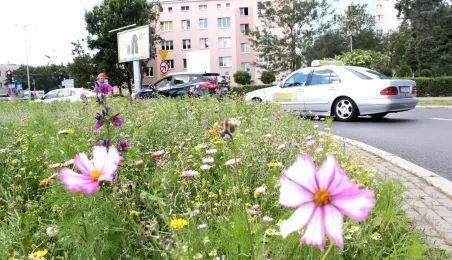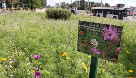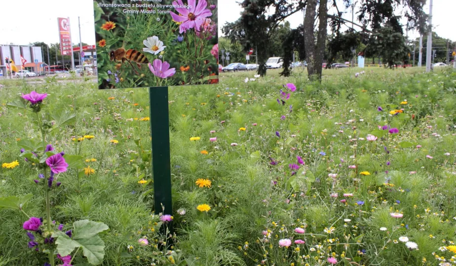 Plac ToMiTo i ul. Gagarina to kolejne miejsca w Toruniu, w których powstały łąki kwietne. Łącznie w 2020 r. w mieście powstało prawie 0,5 ha takich terenów, ograniczajacych skutki suszy i wspierających owady zapylające. Fot. Adam Zakrzewski