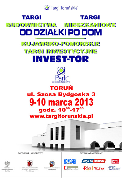 Wszystko, czego potrzeba do wybudowania domu, znaleźć będzie można na VIII Targach Budownictwa i Targach Mieszkaniowych „OD DZIAŁKI PO DOM” oraz VI Kujawsko-Pomorskich Targach Inwestycyjnych „INVEST-TOR”, które odbędą się 9 i 10 marca 2013 r. w Centrum Targowym „PARK” przy Szosie Bydgoskiej 3 w Toruniu.