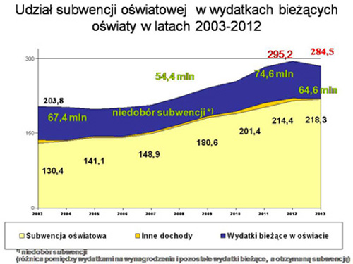 Wydatki na szkolnictwo powinny być finansowane z subwencji oświatowej, którą samorządowi wypłaca rząd. Niestety, od lat do Torunia i wielu innych miejscowości w Polsce nie wpływa ona w pełnej wysokości. W Toruniu tylko w 2012 r. niedobory subwencji oświatowej wyniosły ok. 74 mln złotych. W ciągu dekady do gminnej kasy z budżetu państwa wpłynęło na ten cel o ponad 600 mln złotych mniej niż powinno. Gdyby subwencja wpływała do Torunia w pełnej wysokości, miasto praktycznie nie musiałoby zaciągać kredytów. Różnica między tym, co się miastu należy, a co dostało z budżetu państwa wynosi niemal tyle, ile kosztowała będzie budowa nowego mostu drogowego.