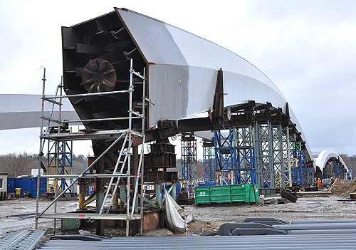 - Łączna masa łuków to 5,5 tys. ton. Ich przetransportowanie drogą wodną na pontonach, następnie osadzenie na podporach i scalenie wymaga sprzyjających warunków pogodowych, czyli odpowiedniego poziomu wody w rzece, brak zjawisk lodowych i prędkości wiatru nie większej niż uwzględniona m.in. w analizach statycznych - na co czekamy z niecierpliwością - mówi Lesław Milewski, dyrektor kontraktu z firmy STRABAG. - Na wyspie trwa montaż pierwszych elementów pomostu. Staramy się również wykonywać prace związane z jej umocnieniem. Chodzi o maksymalne wykorzystanie czasu i realizację zadań możliwych do wykonania przy aktualnie panujących warunkach atmosferycznych.