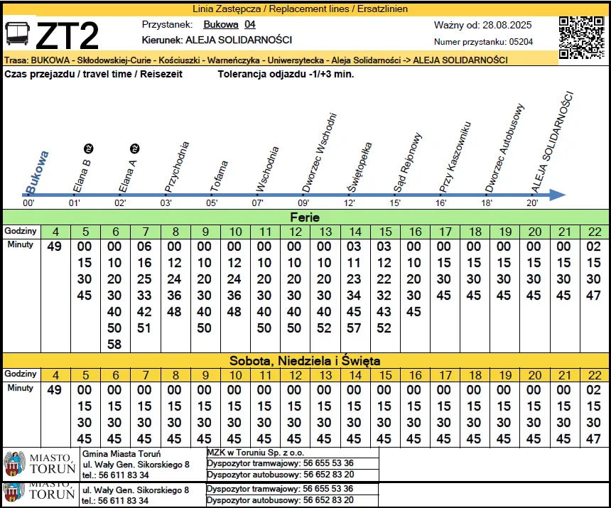 Na trasie wyłączonej z ruchu tramwajowego od al. Solidarności do ul. Bukowej kursować będą zastępczo autobusy linii ZT2. Autobusy będą zatrzymywać się na przystankach autobusowych w pobliżu przystanków tramwajowych.