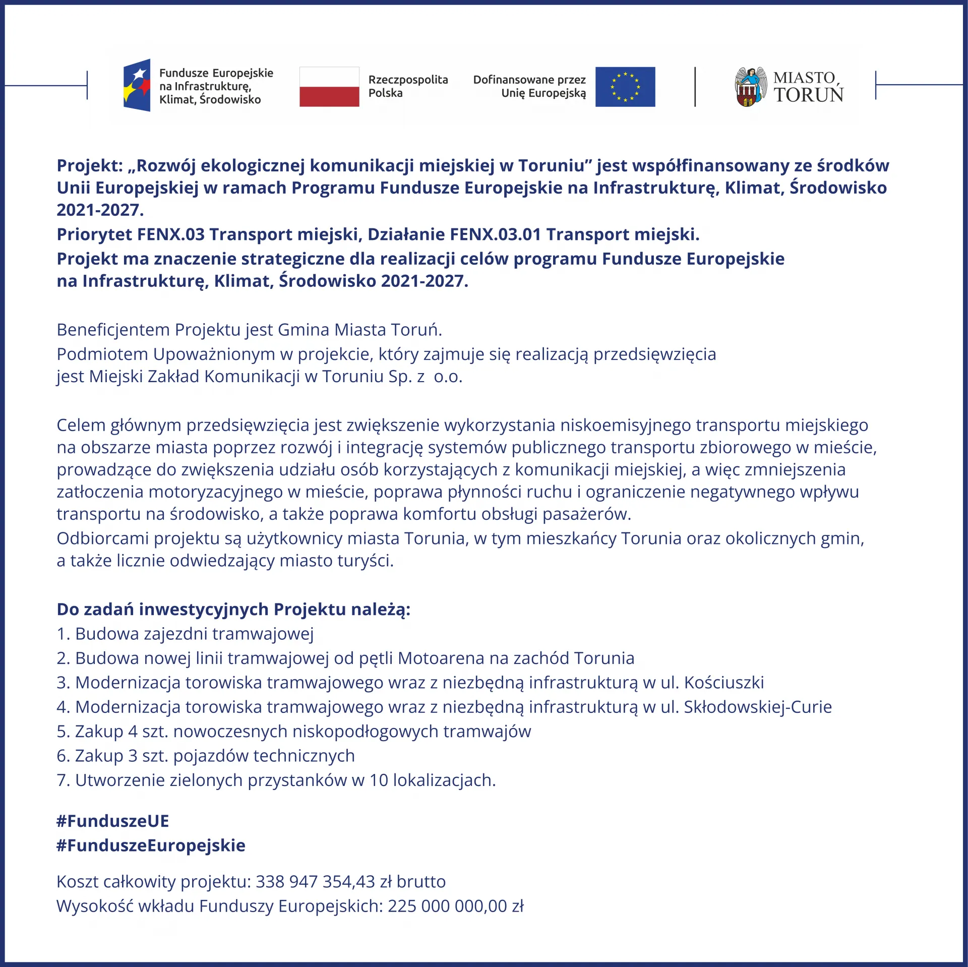 Torowisko w ciągu ul. Kościuszki jest modernizowane w ramach projektu „Rozwój ekologicznej komunikacji miejskiej w Toruniu”, który jest współfinansowany ze środków Unii Europejskiej w ramach Programu Fundusze Europejskie na Infrastrukturę, Klimat, Środowisko 2021-2027.