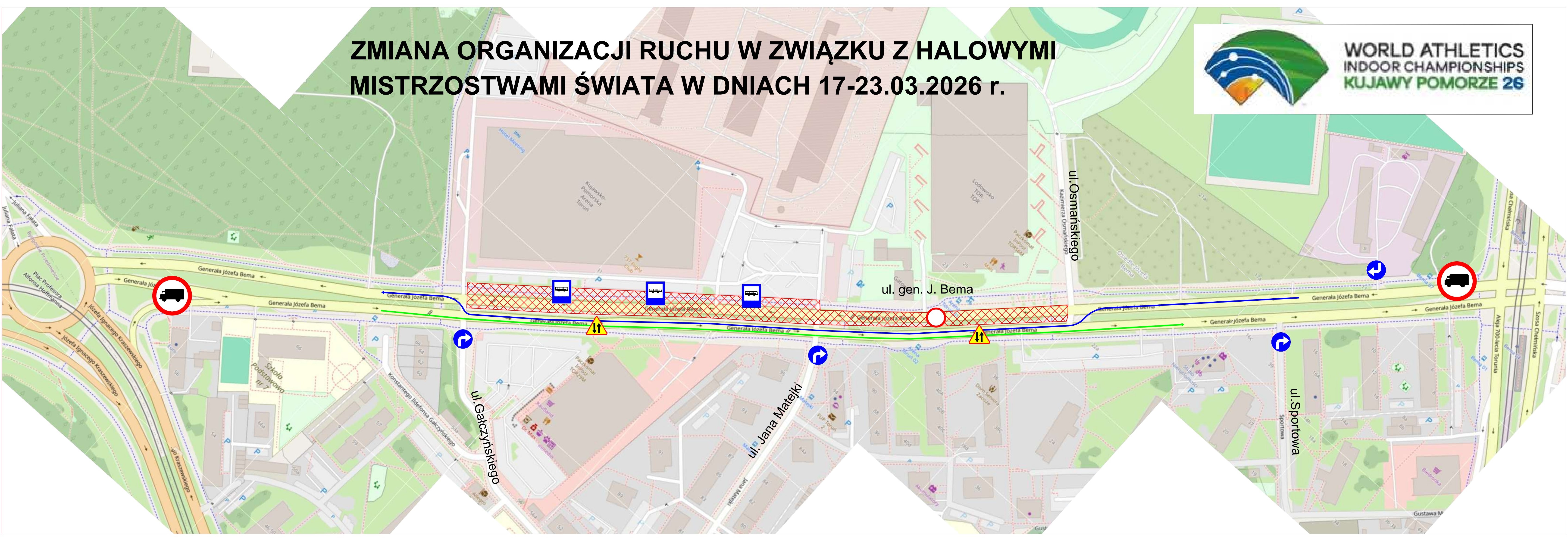 Zmianie ulegnie także organizacja ruchu na placu NOT. W czasie mistrzostw, od 13 do 23 marca, możliwy będzie przejazd na wprost z Szosy Chełmińskiej w aleję Solidarności. Możliwy będzie także skręt z Szosy Chełmińskiej w Czerwona Drogę.
