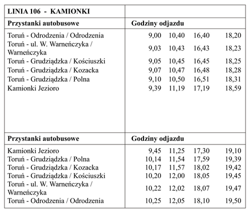 Dobra wiadomość dla torunian pragnących wypocząć nad jeziorem. W sobotę 27 czerwca 2015 r. ruszają wakacyjne kursy nad jezioro w Kamionkach. Autobus MZK linii 106 będzie kursował do 31 sierpnia.