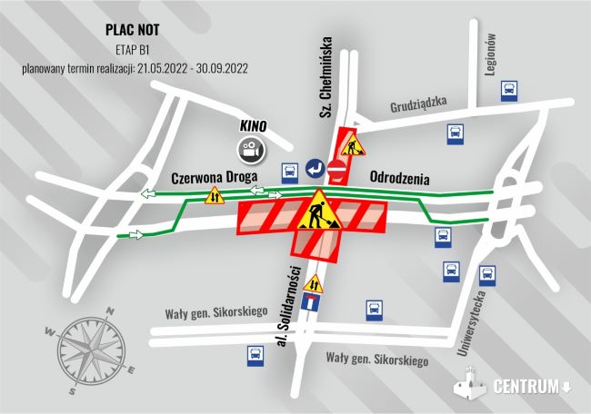 Kolejny etap działań na placu NOT zakłada przeniesienie prac na stronę północną skrzyżowania. O zmianach poinformujemy przed ich wprowadzeniem. Planowany termin rozpoczęcia prac kolejnego etapu robót: 30.09.2022 r.