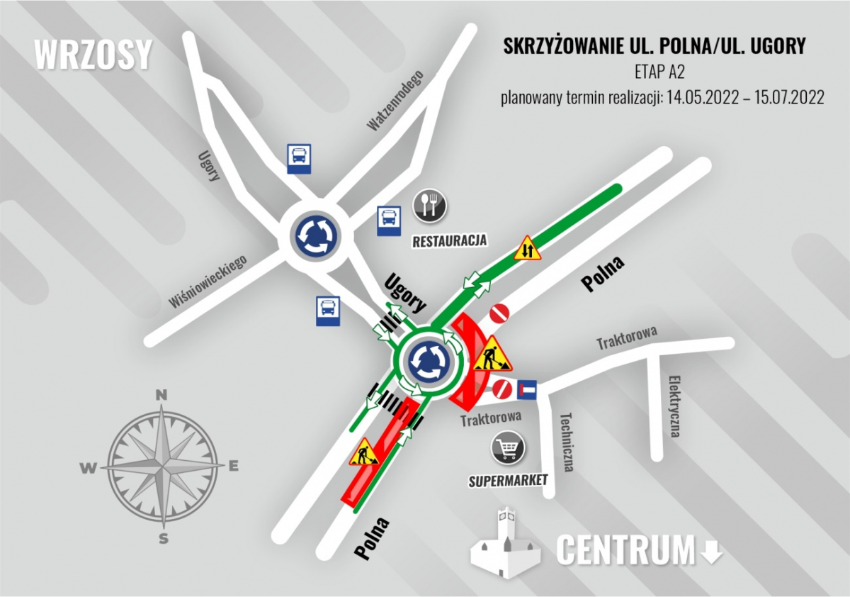 - 14 maja 2022 r. zmieni się organizacja ruchu w rejonie skrzyżowania Polna/Ugory. By umożliwić przejazd, a jednocześnie prowadzić prace, powstanie ta, tymczasowe rondo. Południowa jezdnia ul. Polnej zostanie wyłączona, a ruch zostanie skierowany dwukierunkowo na jezdnię północną. Nie będzie możliwości skrętu z tymczasowego ronda w ul. Traktorową. Sugerowany objazd do ul. Traktorowej - ulicą Polną oraz Forteczną. Zakończenie tego etapu prac planowane jest 15 lipca 2022 r. – mówi prezes Wyszogrodzki.