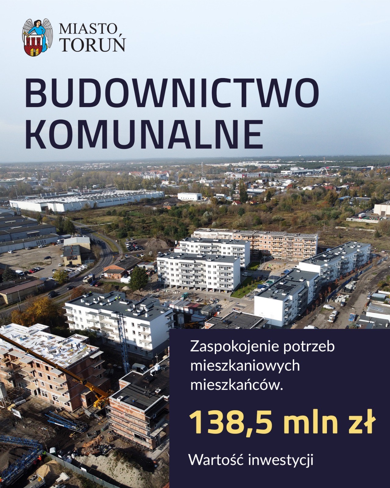 W 2025 roku Toruń przeznaczy rekordowe 496,6 mln zł na inwestycje. Na zaspokojenie potrzeb mieszkaniowych mieszkańców na 2025 roku zaplanowano wydatki w wysokości blisko 140 mln zł. Największą część środków (ponad 125,5 mln zł) stanowią te na gminne budownictwo mieszkaniowe.
