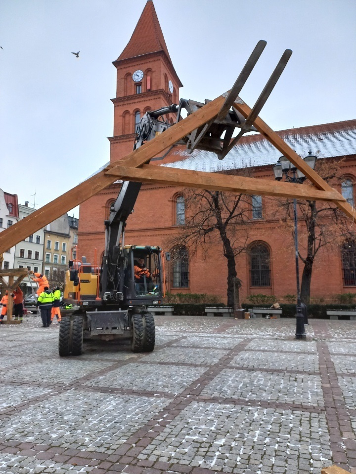 Miejskie Przedsiębiorstwo Oczyszczania rozpoczęło budowę świątecznej szopki na Rynku Nowomiejskim. Będzie gotowa do 15 grudnia 2021 r.