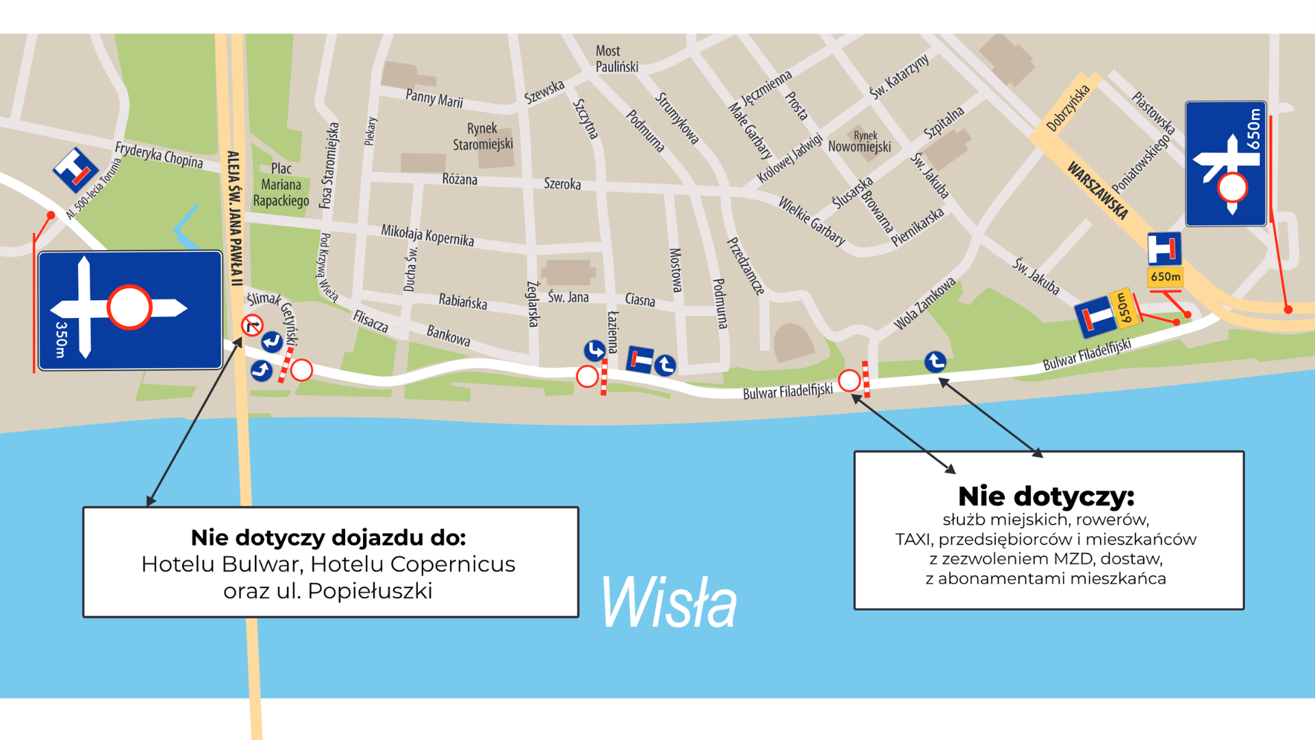 W dniach od 14 do 25 sierpnia 2024 r. zostaną wprowadzone zmiany w ruchu na Bulwarze Filadelfijskim.