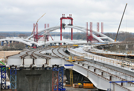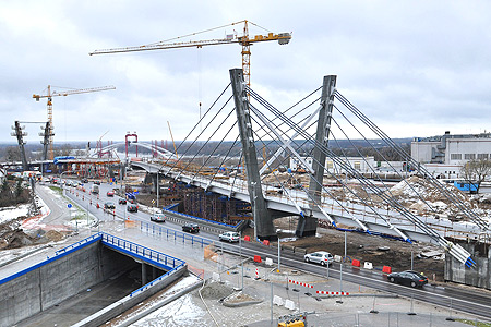 Oczekiwanie na ten kluczowy moment inwestycji nie oznacza zastoju na budowie. Robotnicy wykonują wszystkie możliwe roboty przy pozostałych elementach nowej przeprawy. Najbardziej intensywne prace mają obecnie miejsce w obrębie prawobrzeżnych i lewobrzeżnych estakad. Na placu Daszyńskiego montowane są wanty na pylonie Estakady Żółkiewskiego oraz kolejne elementy konstrukcji stalowej. Robotnicy pracują też przy pozostałych pylonach i podporach: zbroją stropy oraz montują rury osłonowe dla śrub sprężających. Coraz bardziej przypomina kształtem most konstrukcja wzniesiona na lewym brzegu Wisły: tam na gotowych już estakadach trwa zbrojenie, szalowane i spawanie kolejnych sekcji przeprawy.