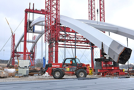 Na placu do scalania i montażu przygotowywano już pontony niezbędne do przeprowadzenia operacji montażu łuków. Proces ten jest uzależniony od warunków pogodowych i hydrotechnicznych. Cały czas są one monitorowane przez specjalnie powołany zespół. Gdy tylko odpowiedni moment nastąpi, skomplikowana operacja zostanie rozpoczęta. Sposób montażu łukowych przęseł został opracowany przez zespół specjalistów specjalnie na potrzeby toruńskiej inwestycji. Gotowe, mierzące 270 metrów długości łuki zostaną zwodowane holownikami, przetransportowane nurtem rzeki, a następnie wbudowane w miejsce docelowe na podpory stałe.