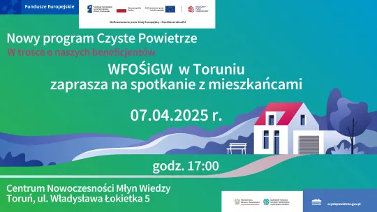 Od 31 marca 2025 r. można składać wnioski w nowej odsłonie Programu Priorytetowego „Czyste Powietrze”. W trosce o beneficjentów Wojewódzki Fundusz Ochrony Środowiska i Gospodarki Wodnej wraz z Wydziałem Środowiska i Ekologii zaprasza mieszkańców Torunia na spotkanie informacyjne na temat Programu" Czyste Powietrze" i wprowadzonych w nim zmian.