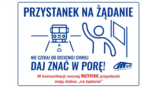 By ułatwić pasażerom korzystanie z takich przystanków i przypomnieć, jakie obowiązują zasady, Miejski Zakład Komunikacji w Toruniu prowadzi kampanię „Daj znać w porę!”. W ramach akcji na przystankach pojawiają się nowe, czytelne informacje graficzne pokazujące, jaki status ma dany przystanek i jak zasygnalizować kierowcy chęć skorzystania z przewozu. Na większości przystanków nowe informacje już wiszą, a w ciągu kilku dni docelowo pojawią się na wszystkich obsługiwanych przez toruński MZK.