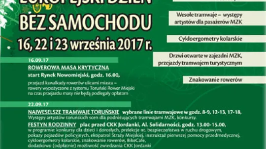 Ponadto osoby będące właścicielami lub współwłaścicielami samochodów osobowych w dniu obchodów Europejskiego Dnia bez Samochodu 22.09.2017 r. (piątek) mogą korzystać z komunikacji miejskiej bezpłatnie, na podstawie dowodu rejestracyjnego pojazdu, którego są właścicielami lub współwłaścicielami, łącznie z dowodem tożsamości.