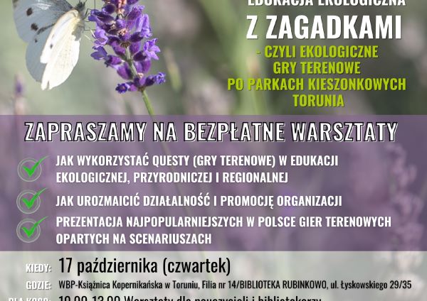 „Edukacja ekologiczna z zagadkami - czyli ekologiczne gry terenowe w Toruniu” to tytuł warsztatów skierowanych do nauczycieli, bibliotekarzy, organizacji pozarządowych, przewodników turystycznych i lokalnych działaczy.