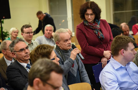 Plany dotyczące zagospodarowania trzeciej części Młynów Richtera, przewężenia na Trasie Średnicowej oraz remont ulicy Prądzyńskiego interesowały mieszkańców osiedli Jakubskie i Mokre podczas spotkania, 10 marca 2016 r. z prezydentem Torunia Michałem Zaleskim.