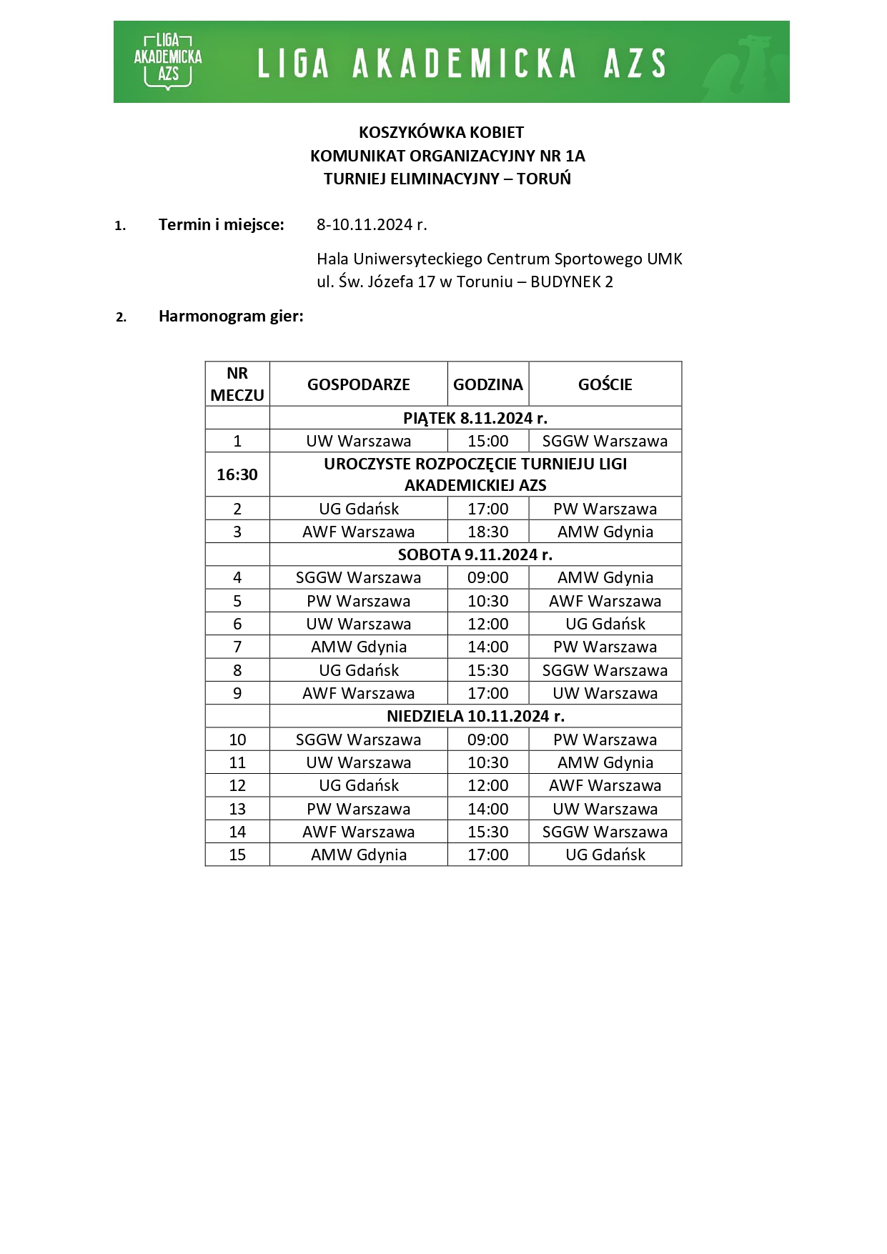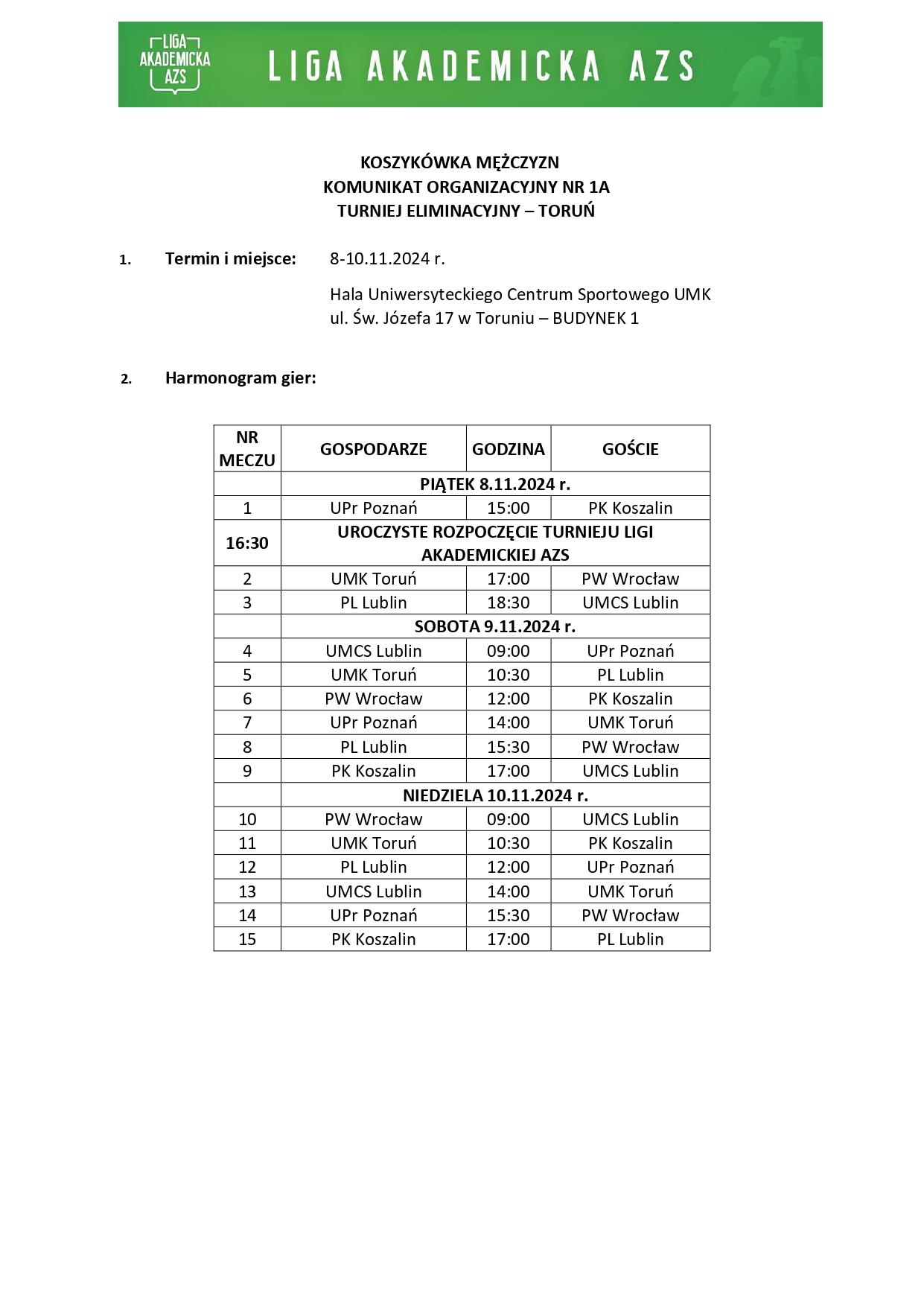 Toruń będzie gospodarzem dwóch turniejów eliminacyjnych „Ligi Akademickiej AZS” w koszykówce kobiet i mężczyzn. Pierwszy z nich zostanie rozegrany w dniach 8-10 listopada 2024 r., a areną zmagań będzie hala Uniwersyteckiego Centrum Sportu UMK przy ul. Św. Józefa.