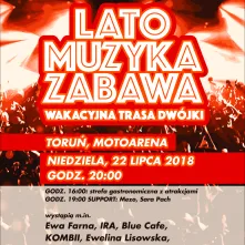 Ewa Farna, Ewelina Lisowska, IRA, Kombii, Blue Cafe, Varius Manx & Kasia Stankiewicz - przeboje tych gwiazd zabrzmią już w najbliższą niedzielę 22 lipca 2018 r. o godz. 20:00 na toruńskiej Motoarenie. Będzie to pierwszy koncert tegorocznej wakacyjnej trasy telewizyjnej Dwójki pod hasłem "Lato, muzyka, zabawa".