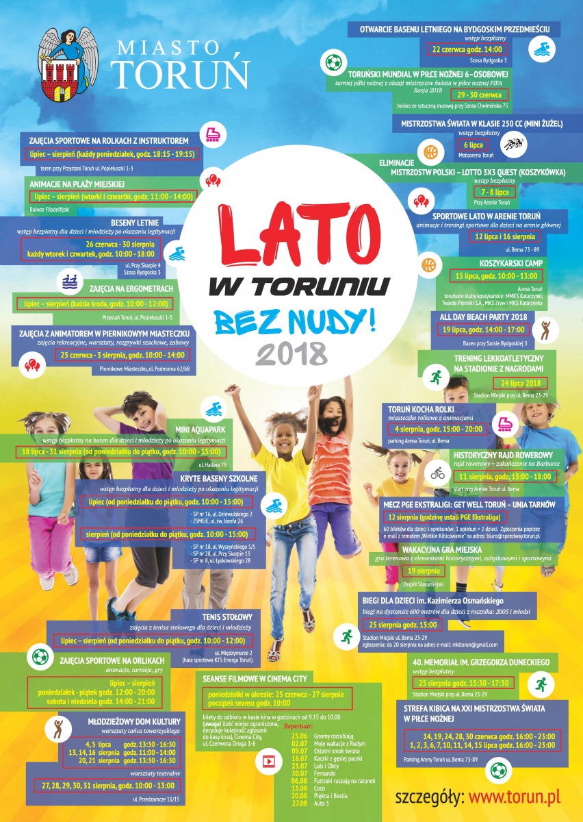 Cykl wakacyjnych wydarzeń zainaugurowało otwarcie 22 czerwca 2018 r. nowego kompleksu basenów letnich na Bydgoskim Przedmieściu. Od poniedziałku 25 czerwca ruszyły natmiast natomiast seanse filmowe w Cinema City. Dla dzieci zostało przygotowanych 10 filmów, które będzie można obejrzeć bezpłatnie za okazaniem szkolnej legitymacji (liczba miejsc ograniczona). Wakacyjne zajęcia odbywać się będą w wielu miejskich obiektach sportu, kultury i rekreacji, szkołach i placówkach popularnonaukowych: w oddziałach Muzeum Okręgowego w Toruniu, w Domu Harcerza, MDK, Domu Muz, Młynie Wiedzy, w Arenie Toruń, w Ogrodzie Zoobotanicznym. Dla dzieci udostępnione będą baseny kryte i plenerowe oraz orliki.