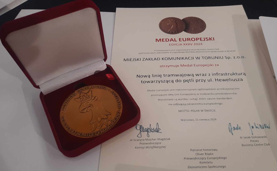 Budowa nowej linii tramwajowej do pętli przy ul. Heweliusza nagrodzona Medalem Europejskim! Prestiżowe wyróżnienie przyznawane przez Business Centre Club oraz Europejski Komitet Ekonomiczno-Społeczny wręczone zostało 11 czerwca 2024 r. w The Oxford Tower w Warszawie.