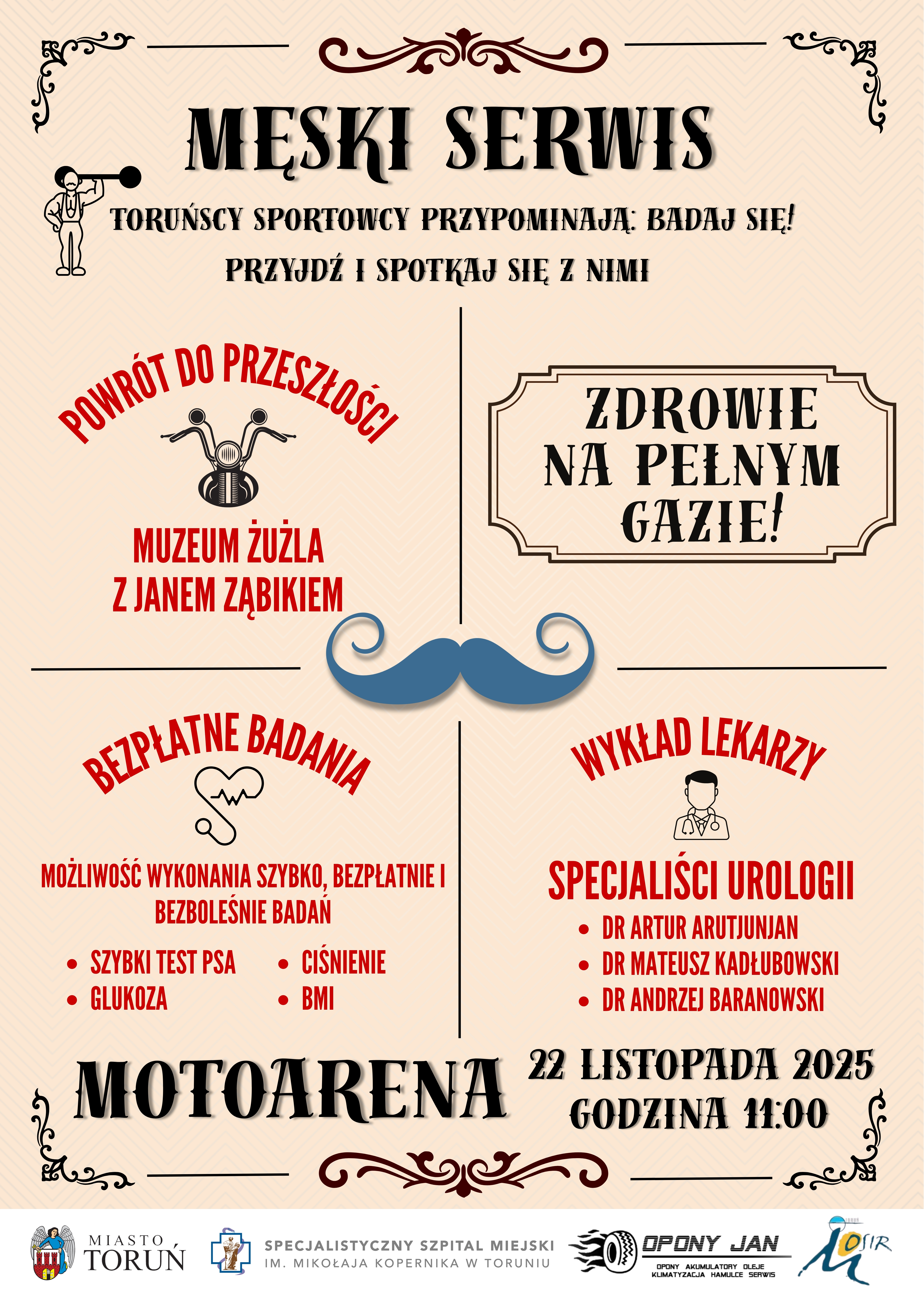 W sobotę, 22 listopada 2025 r., w godz. 11:00-13:00, Motoarena zamieni się w prawdziwe centrum męskiej energii. Gmina Miasta Toruń i Specjalistyczny Szpital Miejski im. M. Kopernika, wraz z partnerami, zapraszają na wyjątkowe wydarzenie pod hasłem „Męski serwis – zdrowie na pełnym gazie”. Bezpłatne badania, spotkania ze specjalistami i sportowcami.