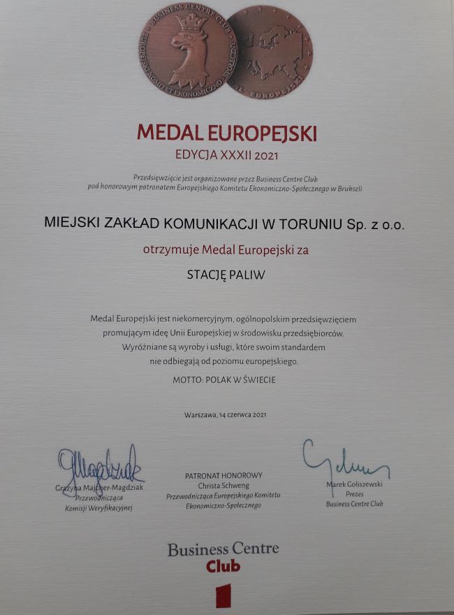 Miejski Zakład Komunikacji w Toruniu został nagrodzony prestiżową nagrodą – Medalem Europejskim. Miejską spółkę doceniono za uruchomienie samoobsługowej stacji paliw na terenie zajezdni autobusowej przy ul. Legionów 220.