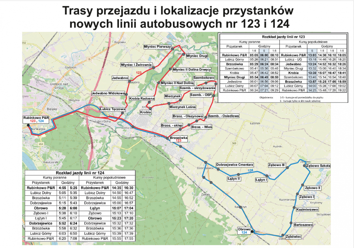 Od 2 stycznia 2024 r. uruchomione zostaną dwie nowe linie autobusowe łączące tereny gmin Obrowo i Lubicz z Toruniem. Nowe połączenia komunikacją miejską zyskają takie miejscowości, jak Jedwabno, Młyniec i Mierzynek w gminie Lubicz oraz Łążyn i Zębowo w gminie Obrowo.
