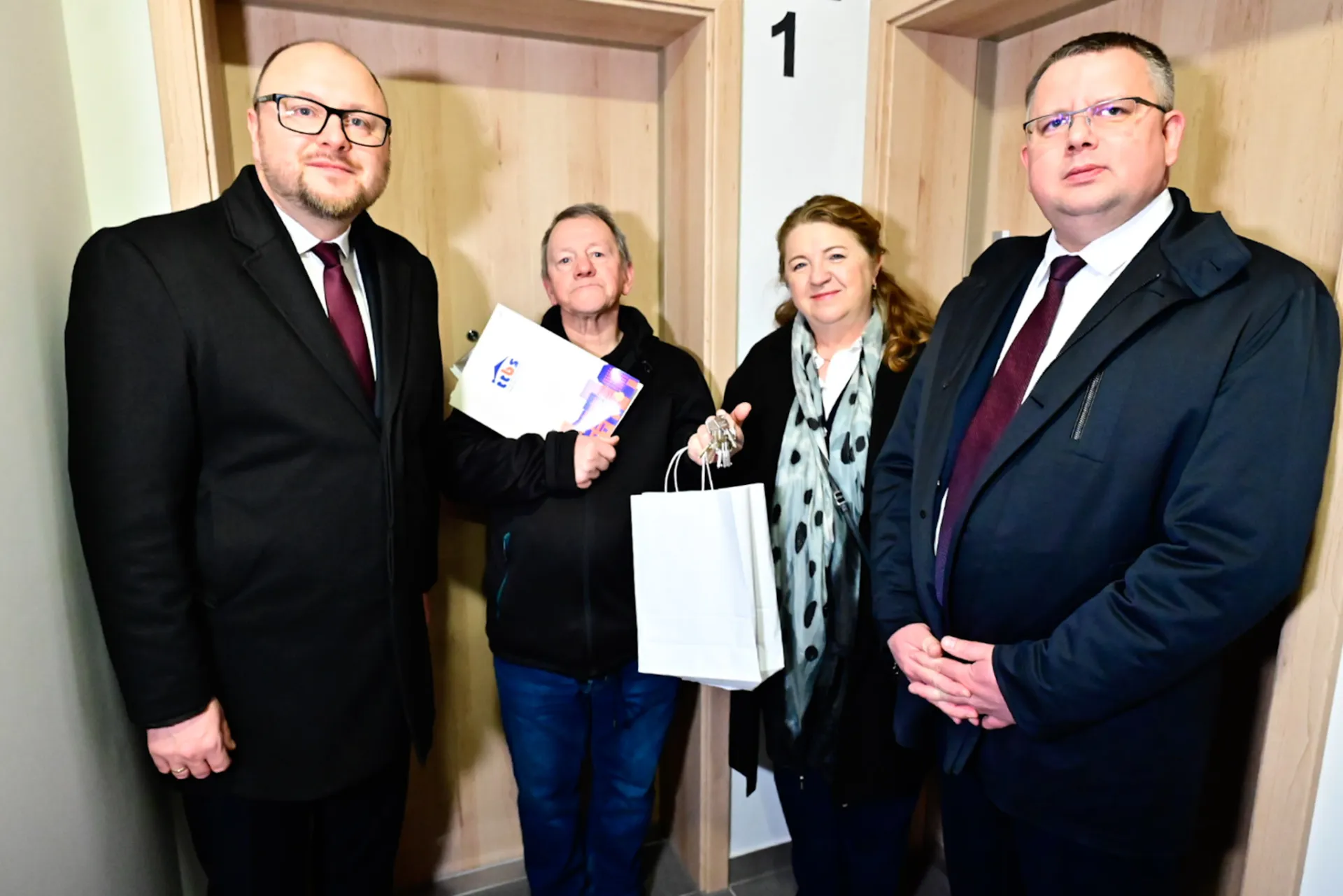 Pan Tadeusz (drugi od lewej) jako pierwszy odebrał klucze do mieszkania nr 1 w budynku przy ul. Batorego 67b.