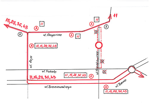 Autobusy linii nr 11, 15, 28, 36 i 43 kursować będą w obu kierunkach objazdem ulicami: Gagarina, Reja, Broniewskiego i Bema.