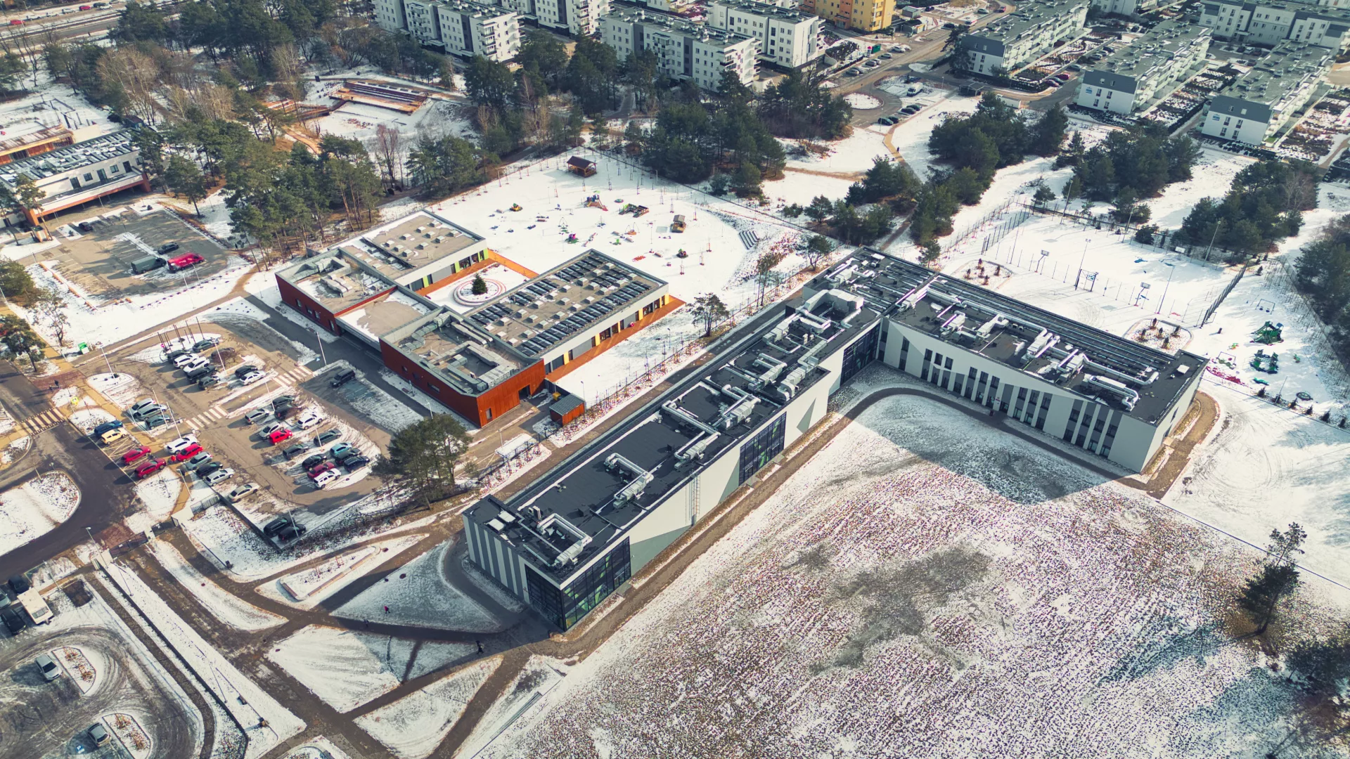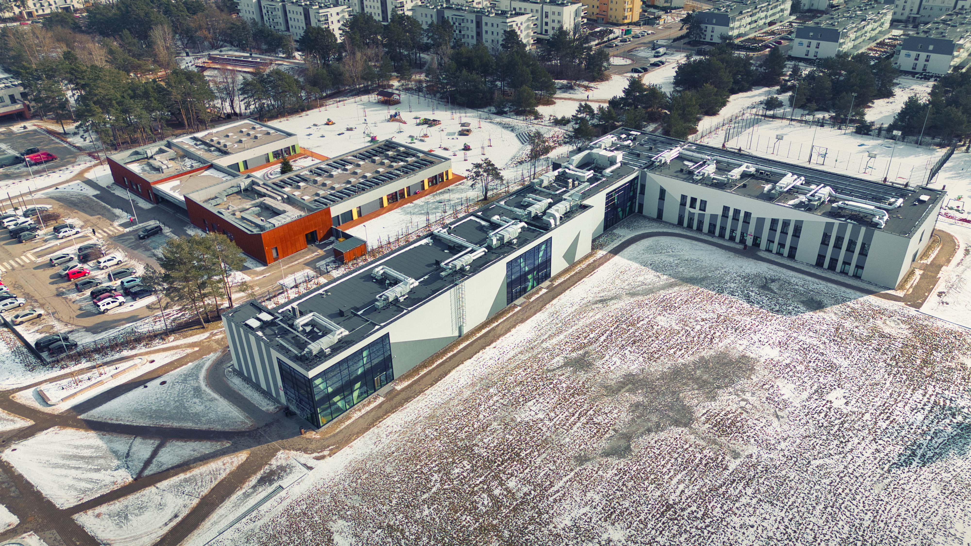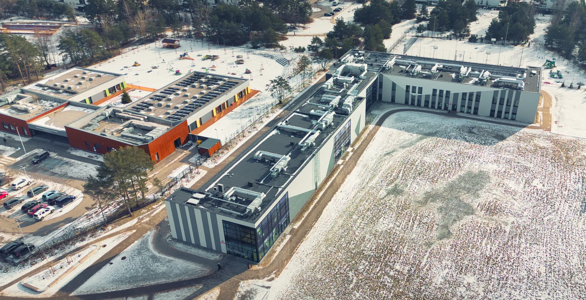 Szkoła zostanie wyposażona w rozwiązania energooszczędne, w tym przegrody zewnętrzne o dobrej izolacyjności, oświetlenie LED z czujkami ruchu w wybranych pomieszczeniach (toalety, szatnie) i na korytarzach oraz odzysk ciepła z instalacji wentylacji mechanicznej.