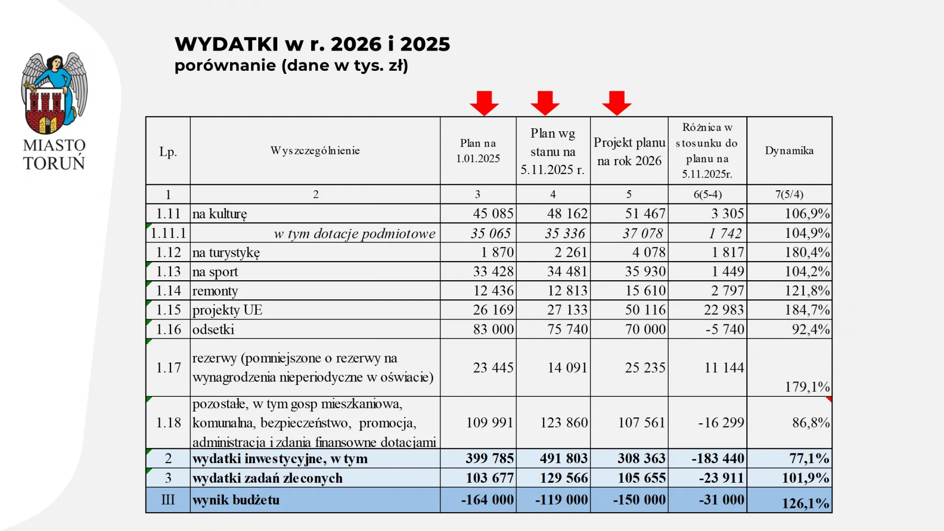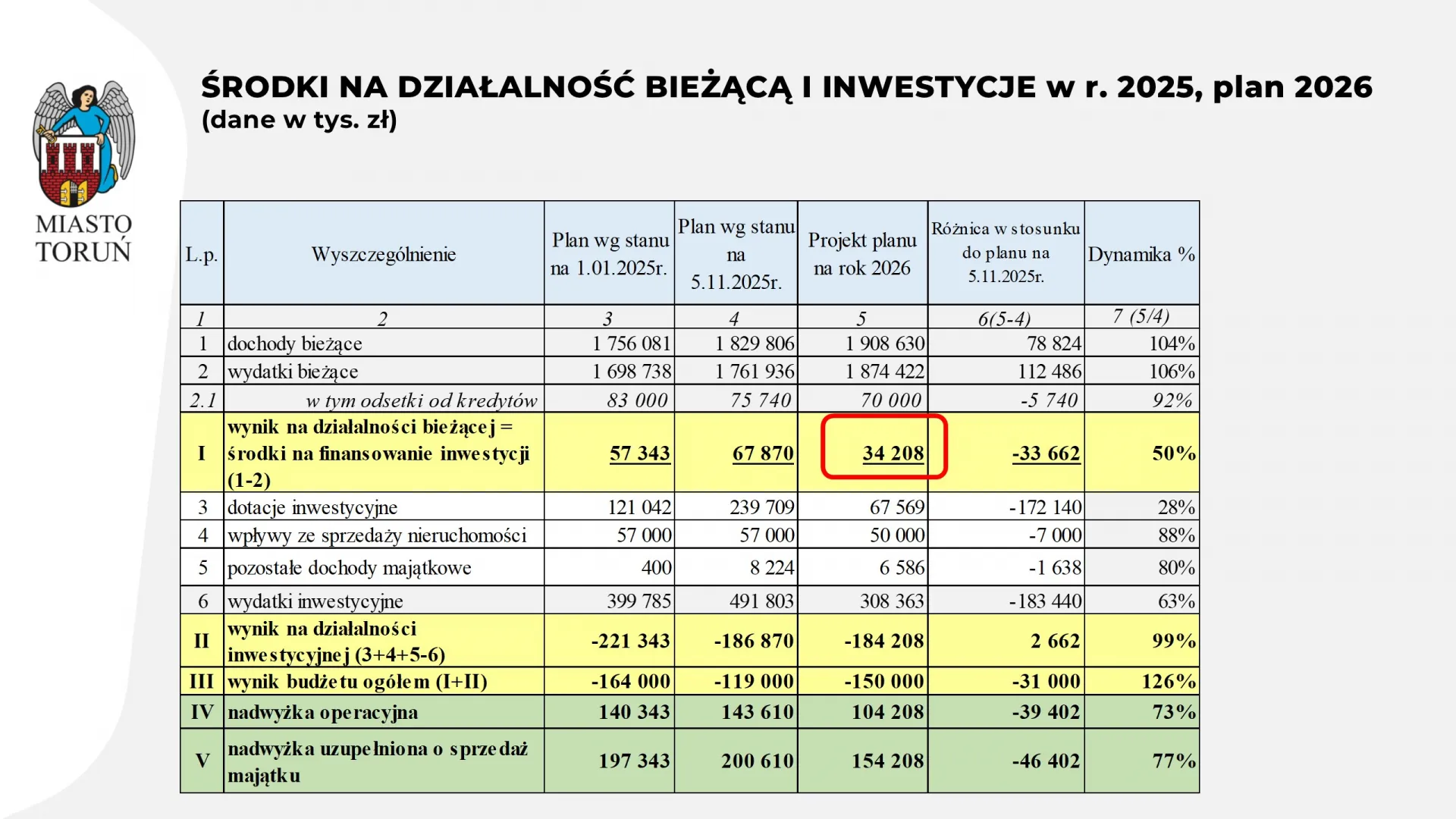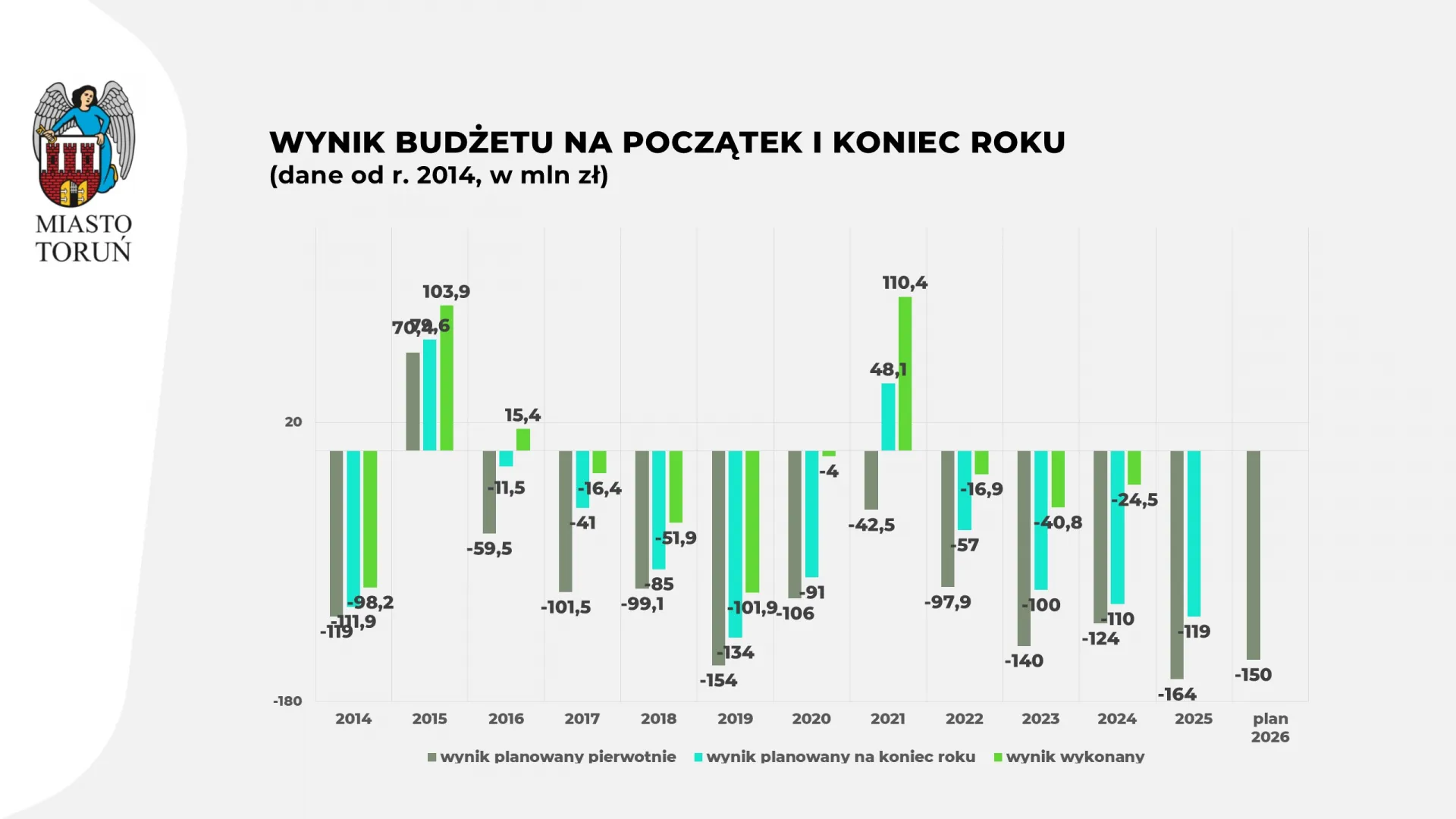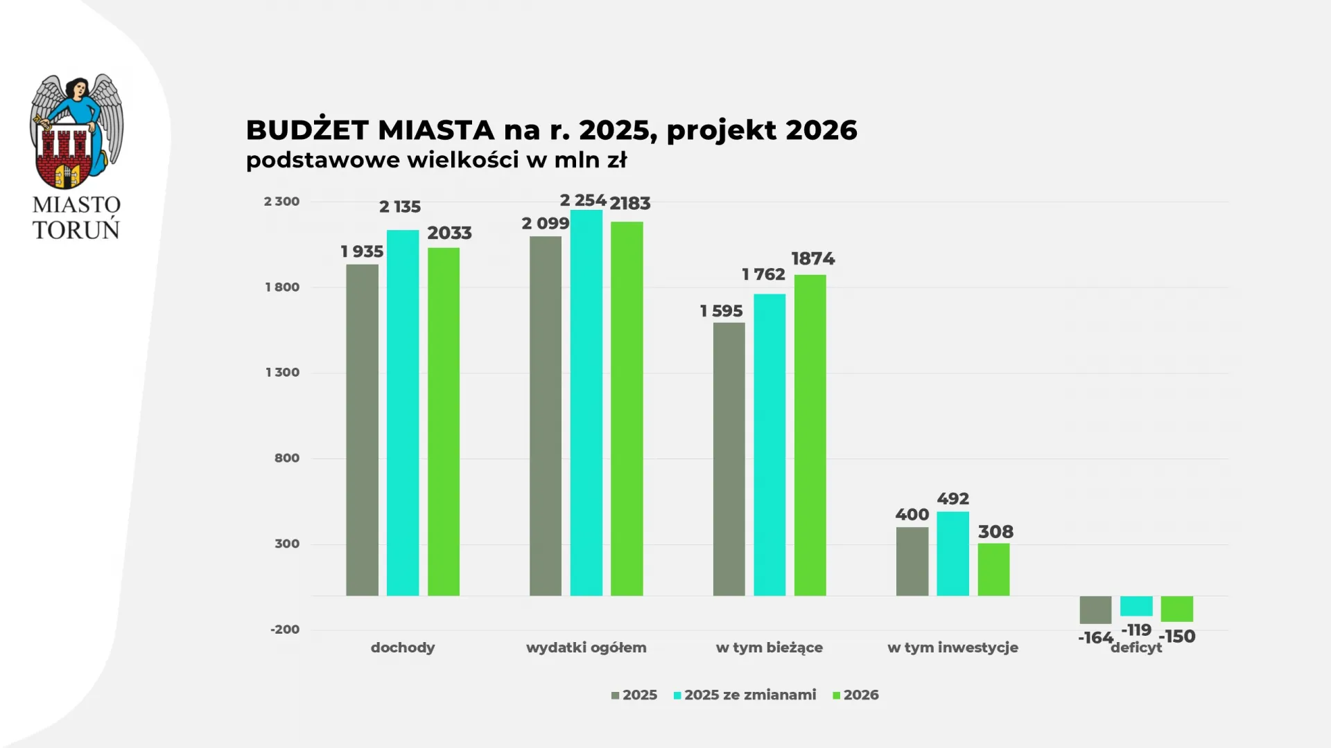 - Cztery parametry determinują plan budżetu na rok 2026: 2 mld 32 mln zł to są dochody ogółem, które wpisaliśmy w projekt budżetu na rok przyszły, 2 mld 182 mln zł to z kolei plan wydatków ogółem, a zatem rysuje nam się kwota, którą musimy dopłacić, by zbilansować obie kolumny. Natomiast 150 mln zł to deficyt jaki planujemy na rok przyszły i 308 mln zł to koszyk inwestycji i wydatków majątkowych, ale przede wszystkim wydatków inwestycyjnych, które planujemy - mówi prezydent Torunia Paweł Gulewski. - Oczywiście te kwoty, które zapisujemy są kwotami „na start”, one są kwotami planowanymi w trakcie trwania roku i budżetu, czego ewidentnym przykładem jest budżet na rok 2025 i wiemy, że będą się one zmieniały. Przypomnę największy w historii deficyt, który zaplanowaliśmy na początek roku 2025, czyli 164 mln zł , zmalał do 119 mln zł i spodziewamy się, że na koniec grudnia może się on zmniejszyć. Tak samo koszyk inwestycji, który planowaliśmy na rok 2025 z 399 mln zł wzrósł do prawie pół miliarda złotych. Należy zatem zakładać, że w trakcie realizacji kolejnych inwestycji, otrzymania dofinansowań, jesteśmy w stanie i na pewno będziemy zwiększać tę kwotę 308 mln zł zaplanowanych jako pierwotną kwotę inwestycji na rok 2026.