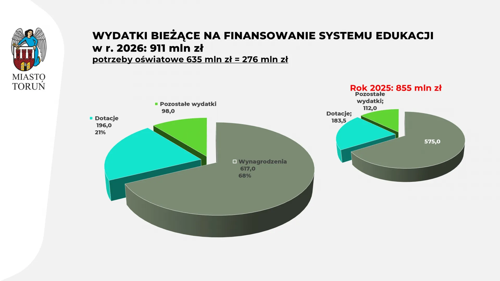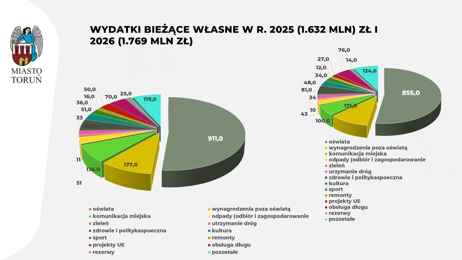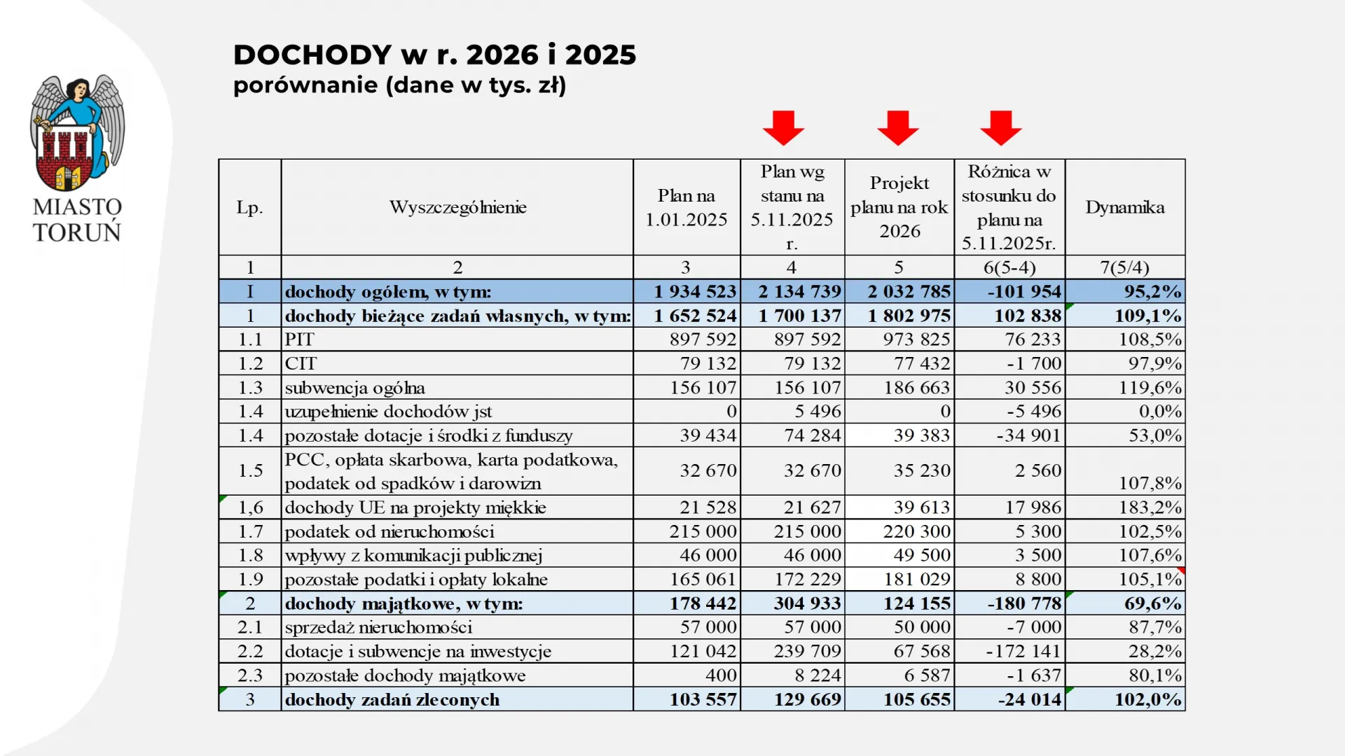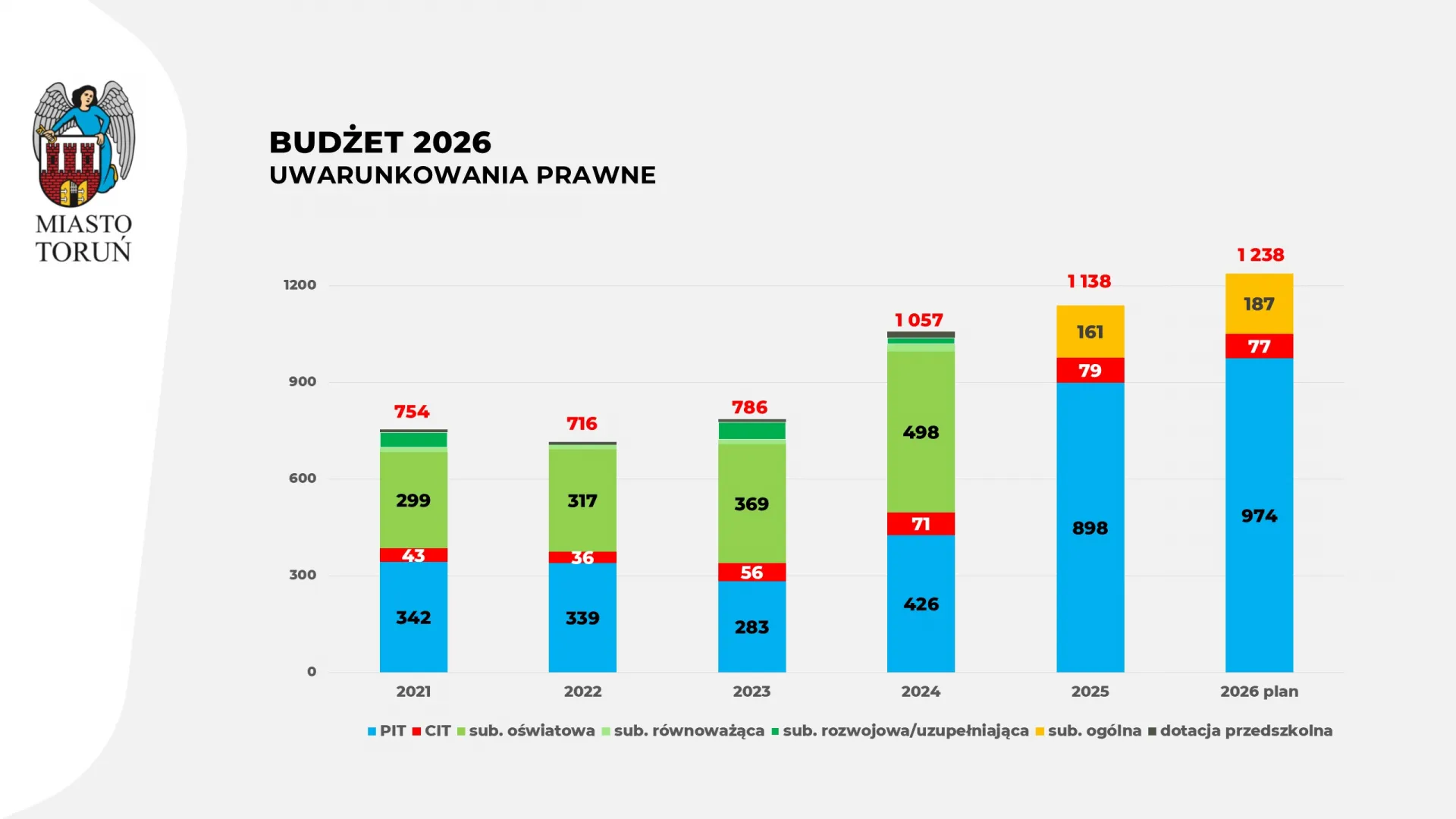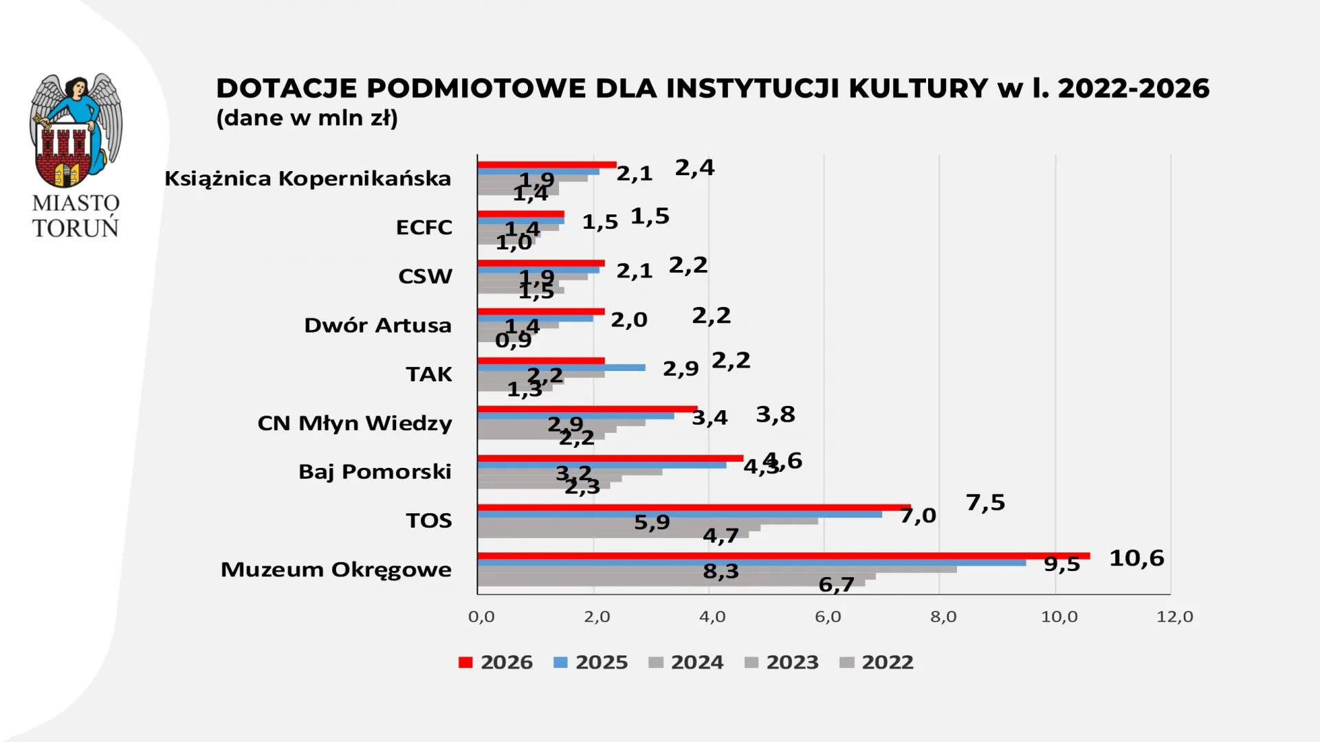 Projekt budżetu na 2026 rok zakłada stabilizację finansów przy jednoczesnym kontynuowaniu inwestycji strategicznych dla rozwoju miasta – zwłaszcza w obszarze kultury, edukacji, transportu, zdrowia i zielonej transformacji. Mimo wymagającej sytuacji finansowej i wysokich kosztów funkcjonowania usług publicznych, Toruń konsekwentnie utrzymuje wysoki poziom inwestycji oraz pozyskuje środki zewnętrzne, które w dużej mierze umożliwiają realizację kluczowych projektów.