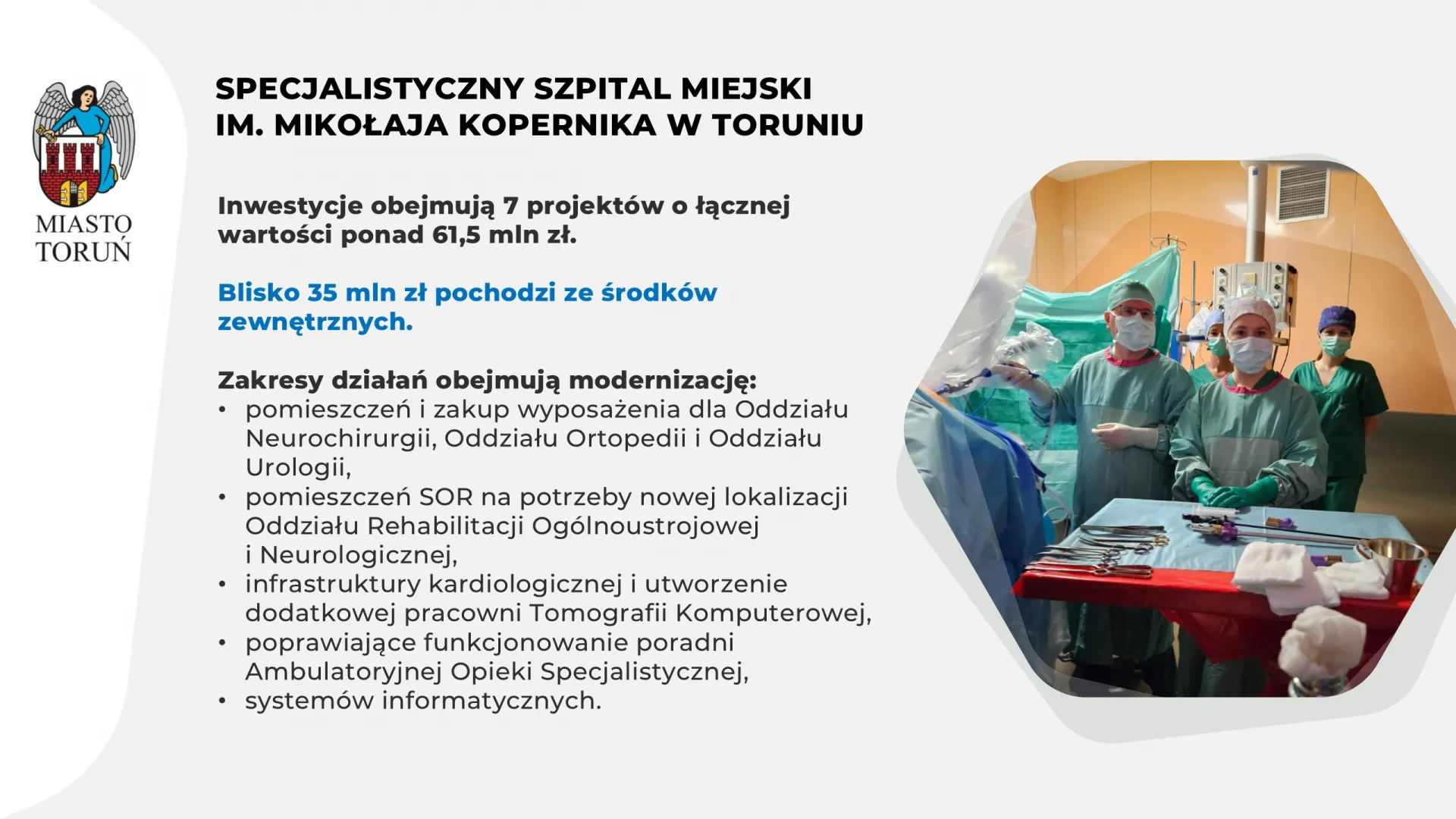 - Największe inwestycje w ochronie zdrowia zaplanowaliśmy w Specjalistycznym Szpitalu Miejskim 61,5 mln zł, z czego 35 mln zł to są środki dotacyjne. Należy podkreślić, że są to środki, które będą realizowane w 2026 i częściowo w 2027 roku. Są to środki z różnych źródeł i źródeł krajowych jak Krajowy Planu Odbudowy, jak i regionalnych  programów – mówi zastępczyni prezydenta Torunia Dagmara Zielińska. – Chcemy pokazać, ze zależy nam na tym, żeby poprawić i podnieść jakość świadczonych usług, żeby ta struktura szpitalna rzeczywiście odpowiadała standardom. Przebudowujemy, zmieniamy pomieszczenia i zakupujemy wyposażenie. Oddział Neurochirurgiczny, oddział kardiologiczny, oddział ortopedyczny, urologiczny, zarówno wyposażenie, remont tych poszczególnych pomieszczeń, ale również otworzenie nowej pracowni tomografii komputerowej, zabezpieczenie infrastruktury krytycznej szpitala, czyli inwestycja w infrastrukturę informatyczną, modernizacja, możliwość przyjmowania dokumentów elektronicznie to są te plany na najbliższe dwa lata, które chcielibyśmy zrealizować. Dodatkowo przy ulicy Szczecińskiej planujemy filię Miejskiej Przychodni Specjalistycznej, gdzie będzie lekarz pierwszego kontaktu POZ, punkt poboru materiału i gabinet zabiegowy.