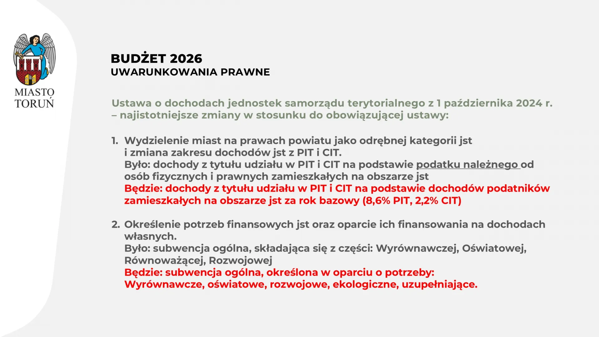 Budżet powstał zgodnie ze zmienionymi przepisami ustawy o dochodach jednostek samorządu terytorialnego, obowiązującej od 1 października 2024 r., które znacząco zmieniły sposób naliczania dochodów z PIT i CIT oraz struktury subwencji ogólnej.