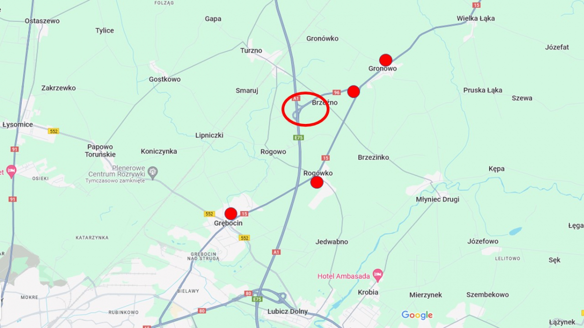 - DK15 Grębocin (skrzyżowanie DK 15 z DW552) Utrudnienia w ruchu wystąpią na odcinku dróg, Grębocin – Gronowo, Grębocin - Turzno, Grębocin – Lubicz