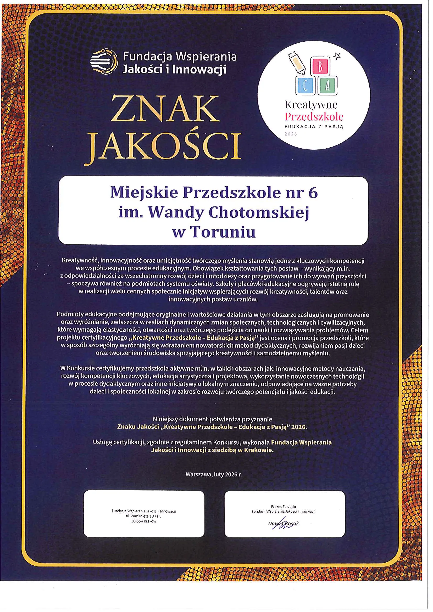 16 lutego 2026 r. w Centrum Konferencyjnym ADN w Warszawie Dorota Pesta, dyrektor Przedszkola Miejskiego nr 6 im. Wandy Chotomskiej w Toruniu odebrała nagrodę przyznaną przedszkolu w ramach Ogólnopolskiego Konkursu Rankingowego "Kreatywne Przedszkole - Edukacja z pasją 2025/2026".