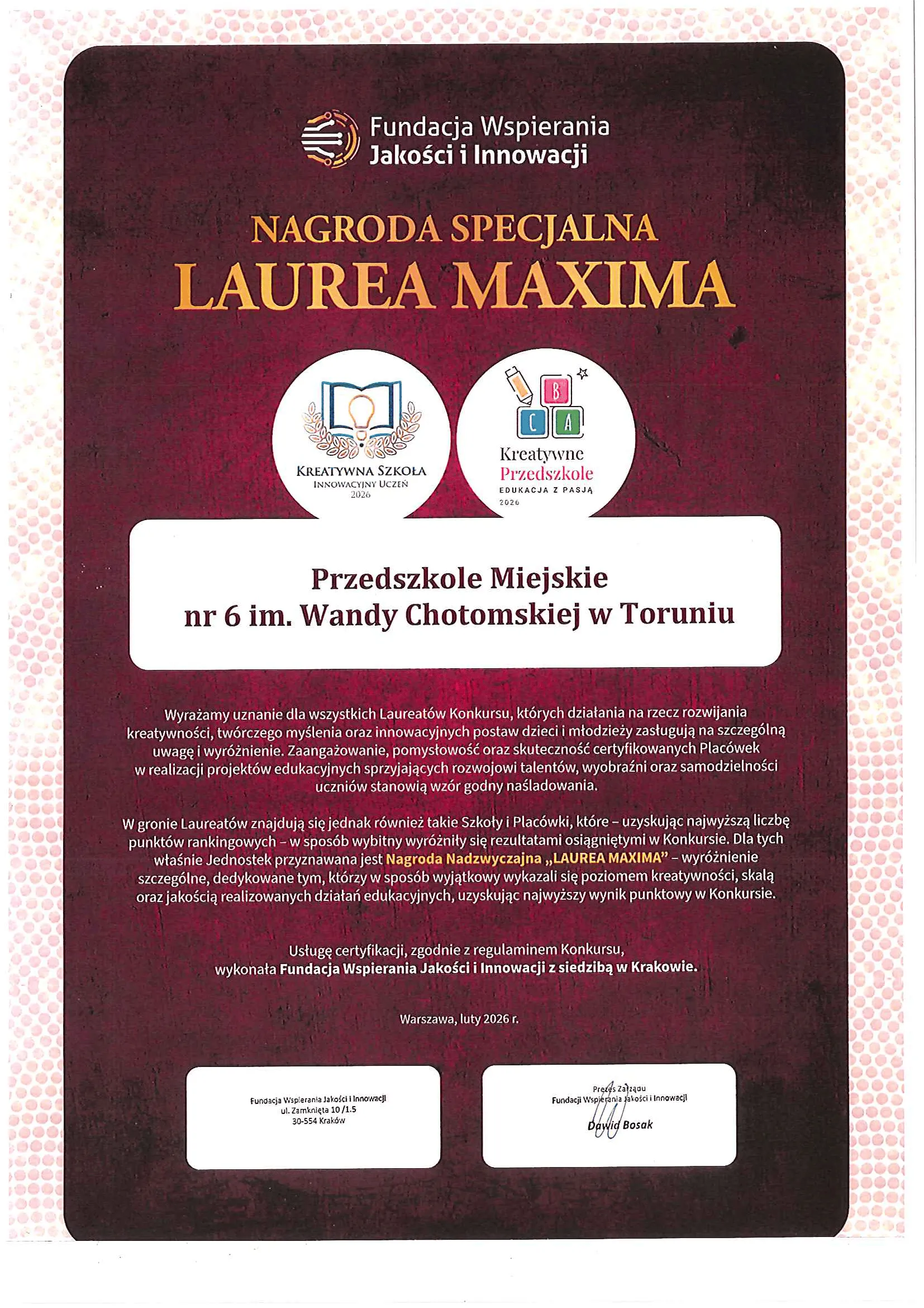 Nagroda "LAUREA MAXIMA" to wyróżnienie szczególne, dedykowane tym, którzy w sposób wyjątkowy wykazali się poziomem kreatywności, skalą oraz jakością realizowanych działań edukacyjnych, uzyskując najwyższy wynik punktowy w konkursie. - Otrzymane nagrody są dla nas potwierdzeniem, że podejmowane działania oraz zaangażowanie całego zespołu pedagogicznego realnie wpływają na jakość kształcenia i rozwój naszych wychowanków - mówi Dorota Pesta, dyrektor przedszkola