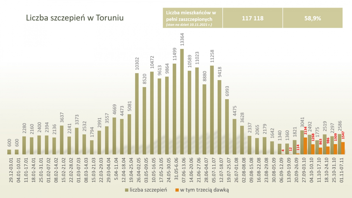 Prezydent zaapelował o odpowiedzialną postawę mieszkańców i korzystanie ze szczepień. Jak dotąd w Toruniu wykonano 215 299 szczepień. W pełni zaszczepiono 117 118 mieszkańców (58,9% wszystkich mieszkańców, 66,74% uprawnionych), a minimum jedną dawką - 119 550 osób. Z kolei trzecią dawką, którą od 2 listopada 2021 r. zaszczepić się mogą wszystkie osoby w pełni zaszczepione w wieku powyżej 18 lat, po odczekaniu 180 dni od poprzedniej dawki, zaszczepiło się łącznie w naszym mieście 8237 osób (stan na 7.11.2021 r.).