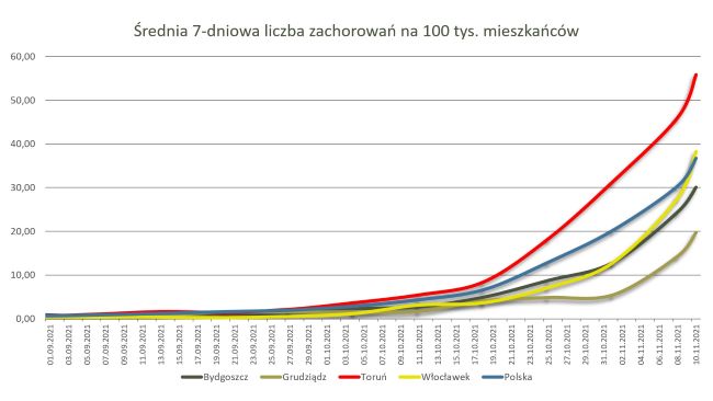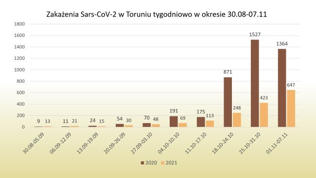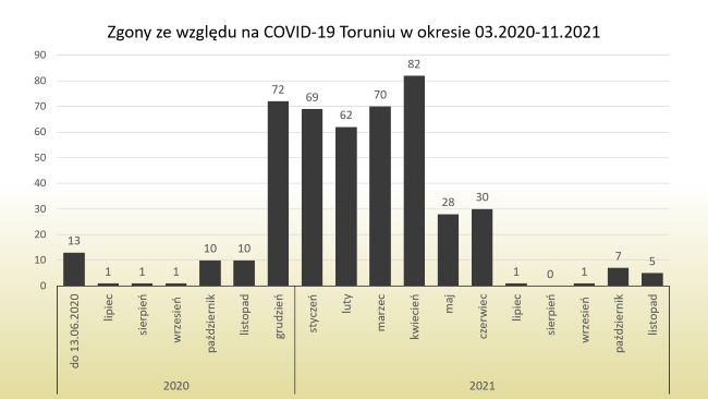 W ciągu pierwszych 10 dni listopada 2021 roku w Toruniu zanotowano 952 przypadki zachorowania na COVID-19. W tym czasie pięć osób zmarło w wyniku zarażenia koronawirusem oraz chorób współistniejących.