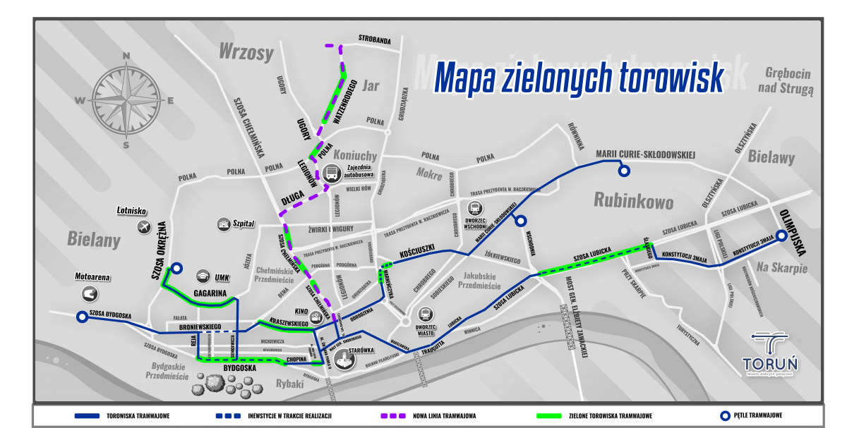 Zielone torowisko to kolejny element przestrzeni miejskiej, który poprawia stan środowiska naturalnego. Dzięki zastosowaniu specjalnej konstrukcji i nawierzchni roślinnej, zielone torowisko ogranicza drgania i hałas oraz absorbuje pyły z ulicznego powietrza. Zatrzymuje też wilgoć, dzięki czemu minimalizowany jest efekt tzw. miejskiej wyspy ciepła. Zielonych torowisk w Toruniu przybywa z każdą inwestycją realizowaną przez Gminę Miasta Toruń za pośrednictwem Miejskiego Zakładu Komunikacji. Tak będzie także w przypadku największego zadania na przestrzeni kilku ostatnich lat – budowy nowej linii tramwajowej do tzw. osiedla Jar.