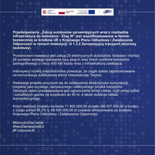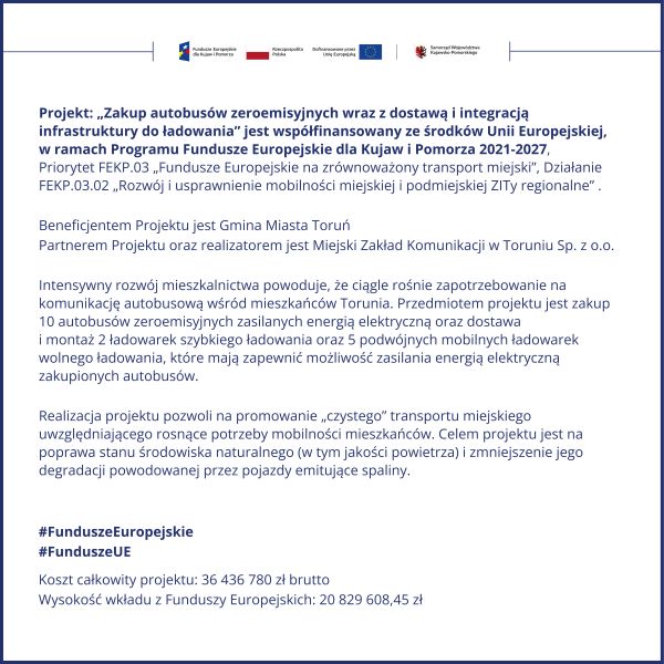 - Przetarg był ogłoszony na dostawę 10 sztuk fabrycznie nowych elektrycznych autobusów elektrycznych z opcją zakupu maksymalnie 30 dodatkowych autobusów o takich samych parametrach. W związku z tym, że uzyskano dofinansowanie łącznie na zakup 35 elektryków – na 25 z Krajowego Planu Odbudowy i Zwiększania Odporności, a na 10 z Funduszy Europejskich dla Kujaw i Pomorza - oprócz podstawowego zamówienia, obejmującego zakup 10 autobusów uruchomione zostanie prawo opcji na zakup dodatkowych 25 autobusów. Pozostałe pięć autobusów, dostępnych w ramach prawa opcji, planujemy sfinansować ze środków KPO. Wniosek o dofinansowanie został złożony w styczniu i trwa jego weryfikacja – wyjaśnia prezes Miejskiego Zakładu Komunikacji w Toruniu Zbigniew Wyszogrodzki.