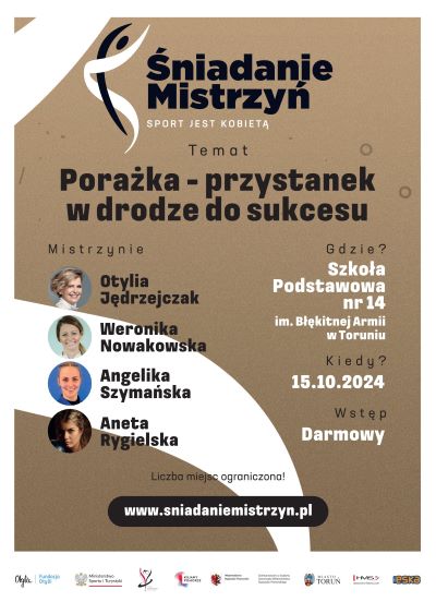 – Myślę, że nie ma człowieka, który nigdy nie musiał pogodzić się z porażką. Sama wiem doskonale, że podnoszenie po upadku bywa bardzo trudne, a żeby odnieść sukces, trzeba umieć dobrze tę porażkę wykorzystać. O sposobach na przepracowywanie porażek będziemy rozmawiać w Toruniu z wybitnymi mistrzyniami sportu – mówi Otylia Jędrzejczak. Organizację „Śniadania Mistrzyń” wsparły Ministerstwo Sportu i Turystyki, samorząd województwa kujawsko-pomorskiego, miasto Toruń oraz marka HMS Fitness.