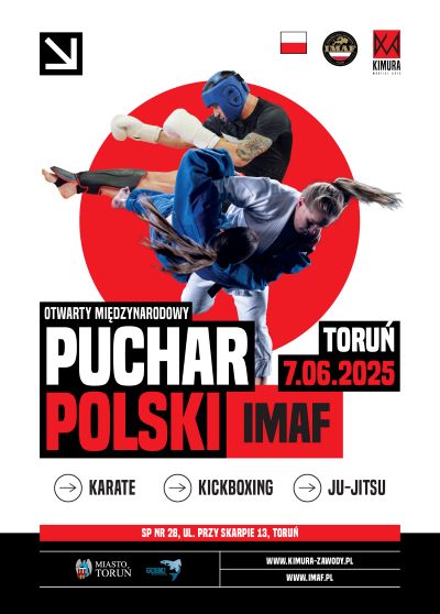 7 czerwca 2025 r. - kolejna edycja Otwartego Międzynarodowego Pucharu Polski IMAF - Karate, Kickboxing, Ju Jitsu. Turniej odbędzie się w różnych kategoriach wiekowych i wagowych – od dzieci po seniorów – i będzie doskonałą okazją do sportowej rywalizacji, wymiany doświadczeń i integracji środowiska sztuk walki. W wydarzeniu udział wezmą zawodnicy z Polski i zagranicy, którzy będą rywalizować w trzech głównych dyscyplinach: karate tradycyjnym i sportowym, kickboxingu – formuły light i point fighting oraz ju jitsu – techniki obronne i sportowe.