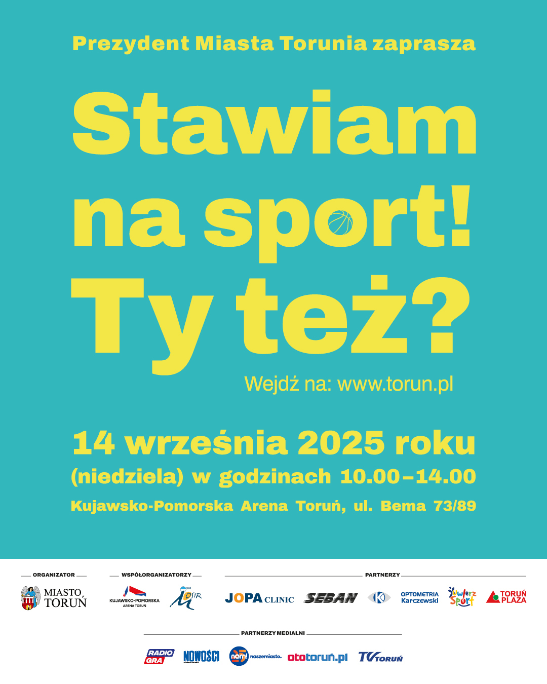 W niedzielę, 14 września 2025 r., w Narodowy Dzień Sportu zapraszamy wszystkich mieszkańców do Kujawsko-Pomorskiej Areny Toruń na drugą edycję wyjątkowego wydarzenia „Stawiam na Sport! Ty też?”.