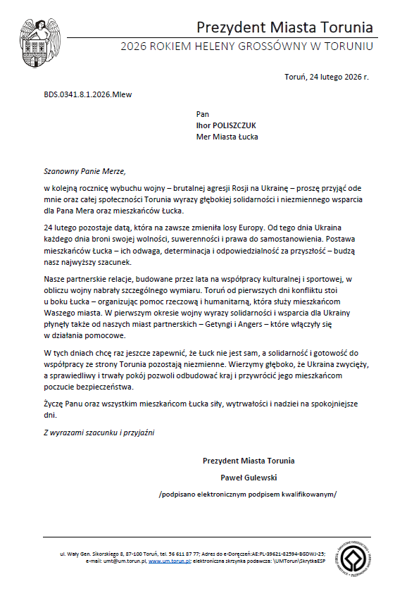 Prezydent Miasta Torunia Paweł Gulewski w 4. rocznicę wybuchu wojny w Ukrainie wystosował list do Ihora Poliszczuka, Mera Miasta Łucka.